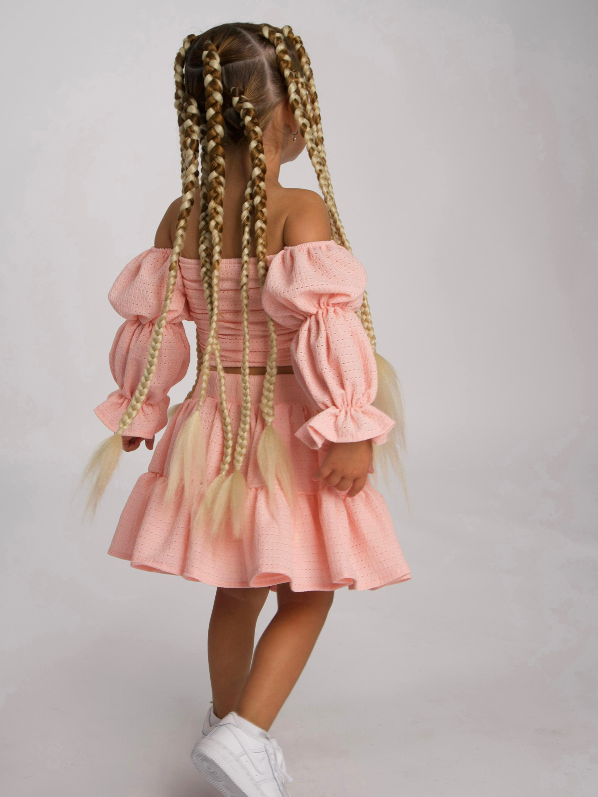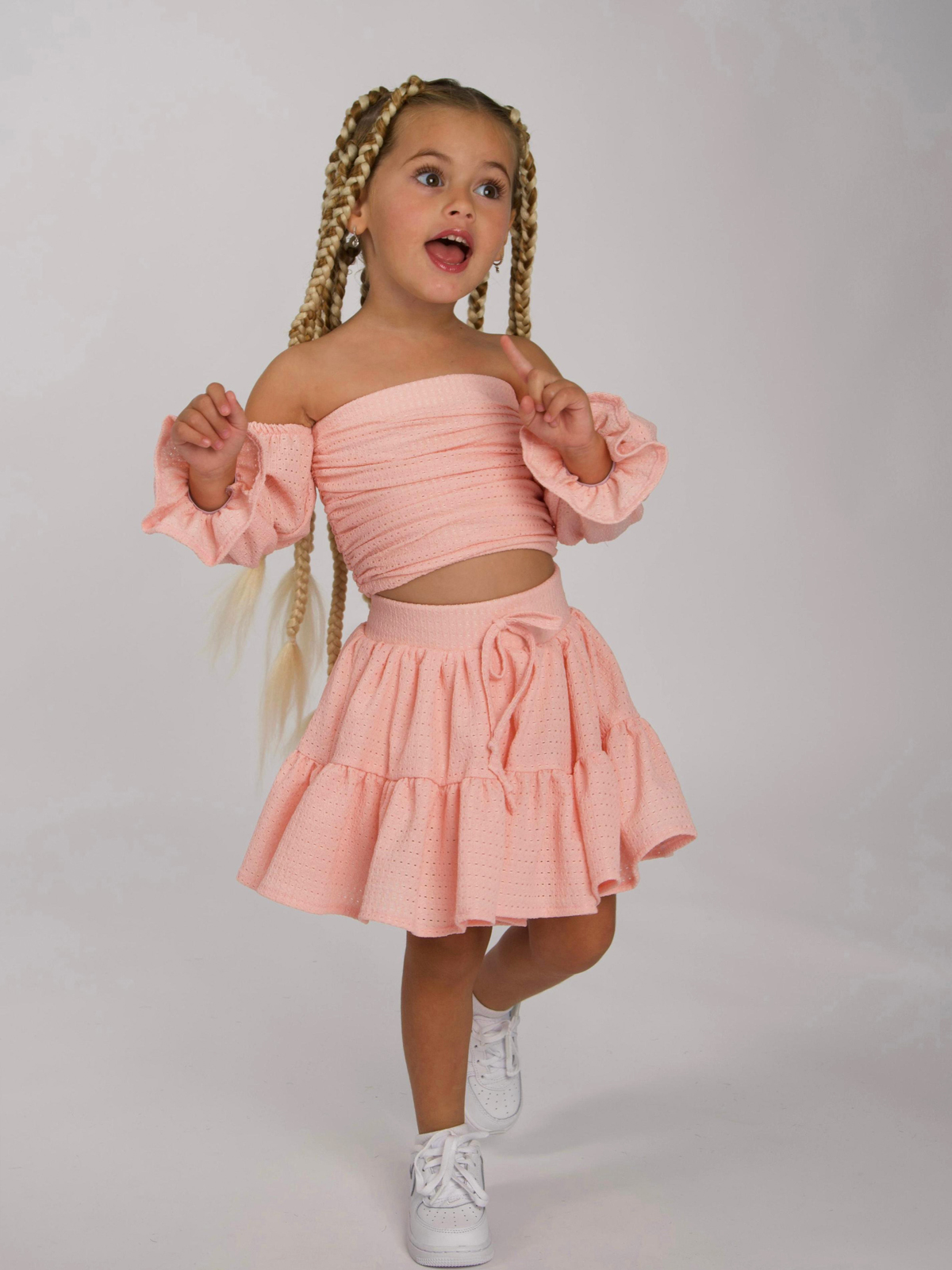 סט חצאית מסתובבת וטופ כיווצים מבד רך ונושם