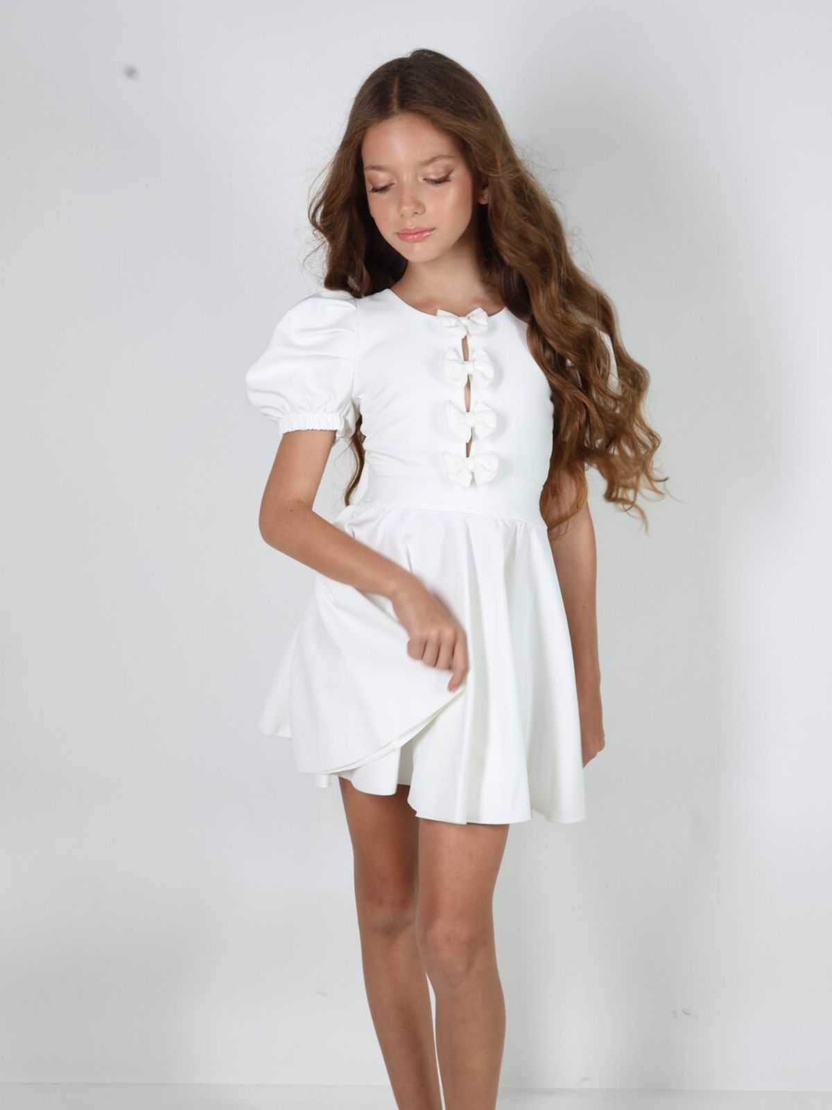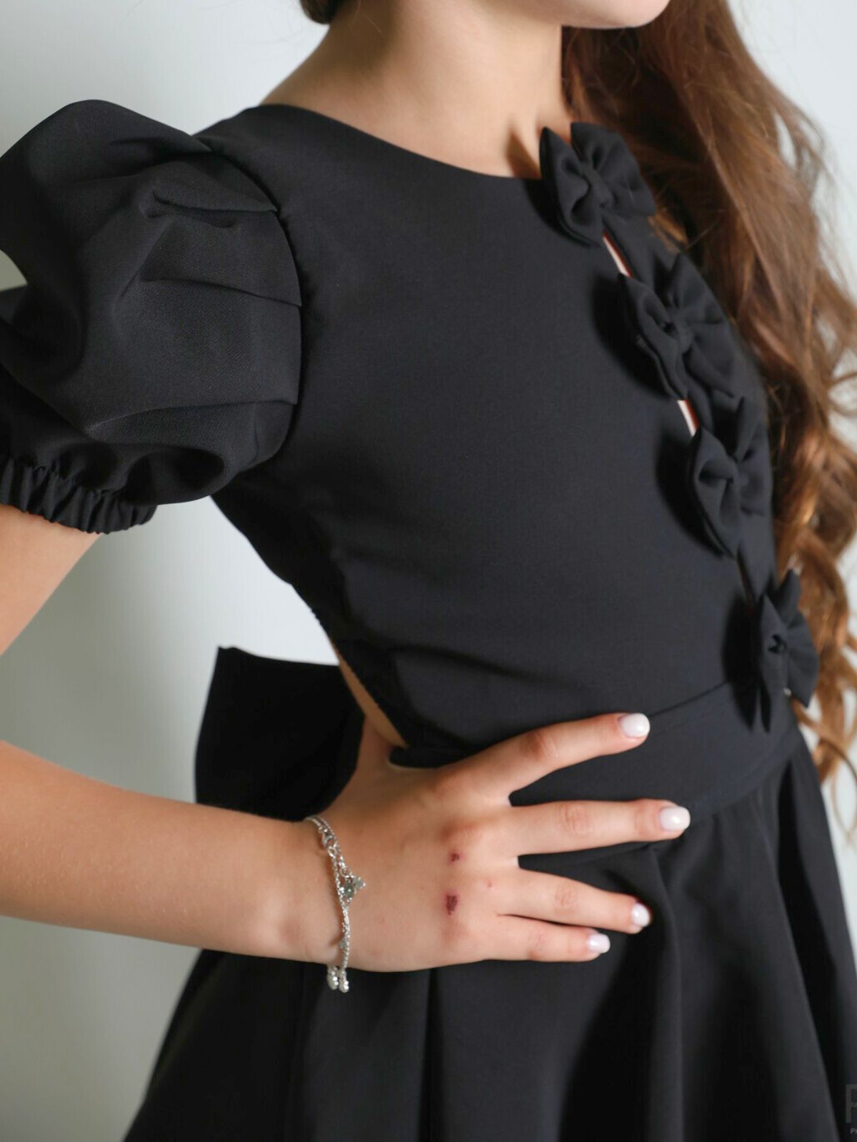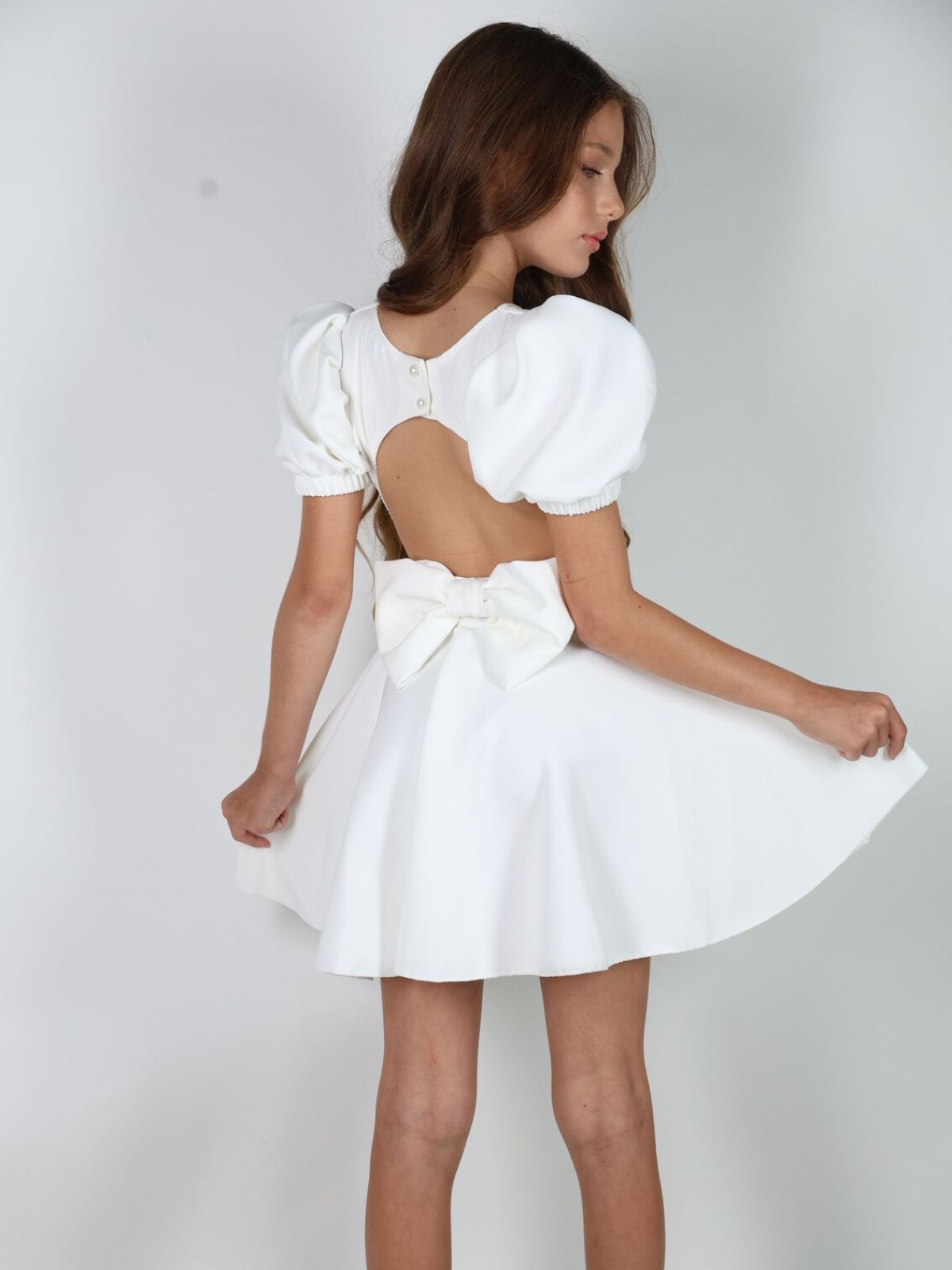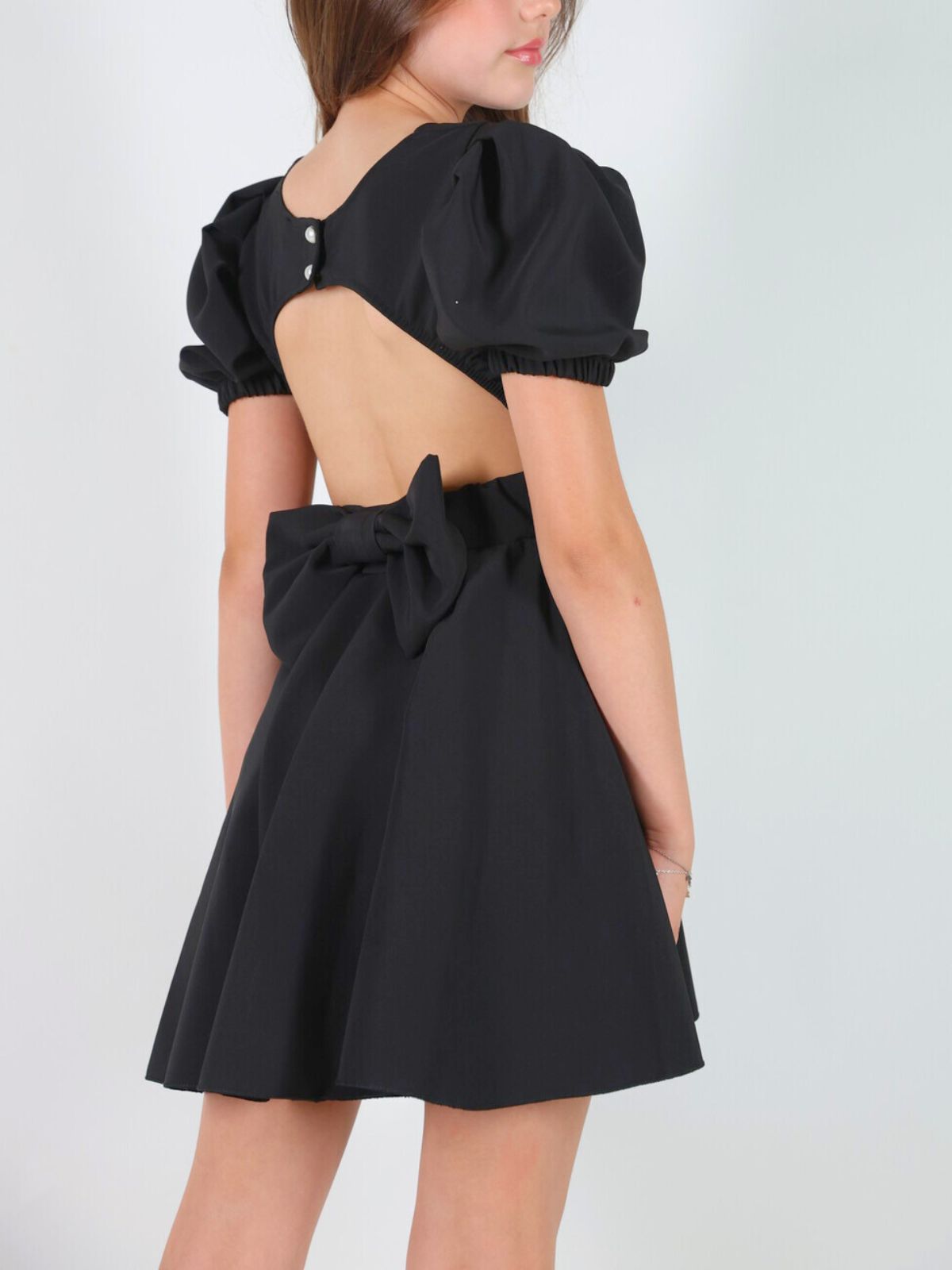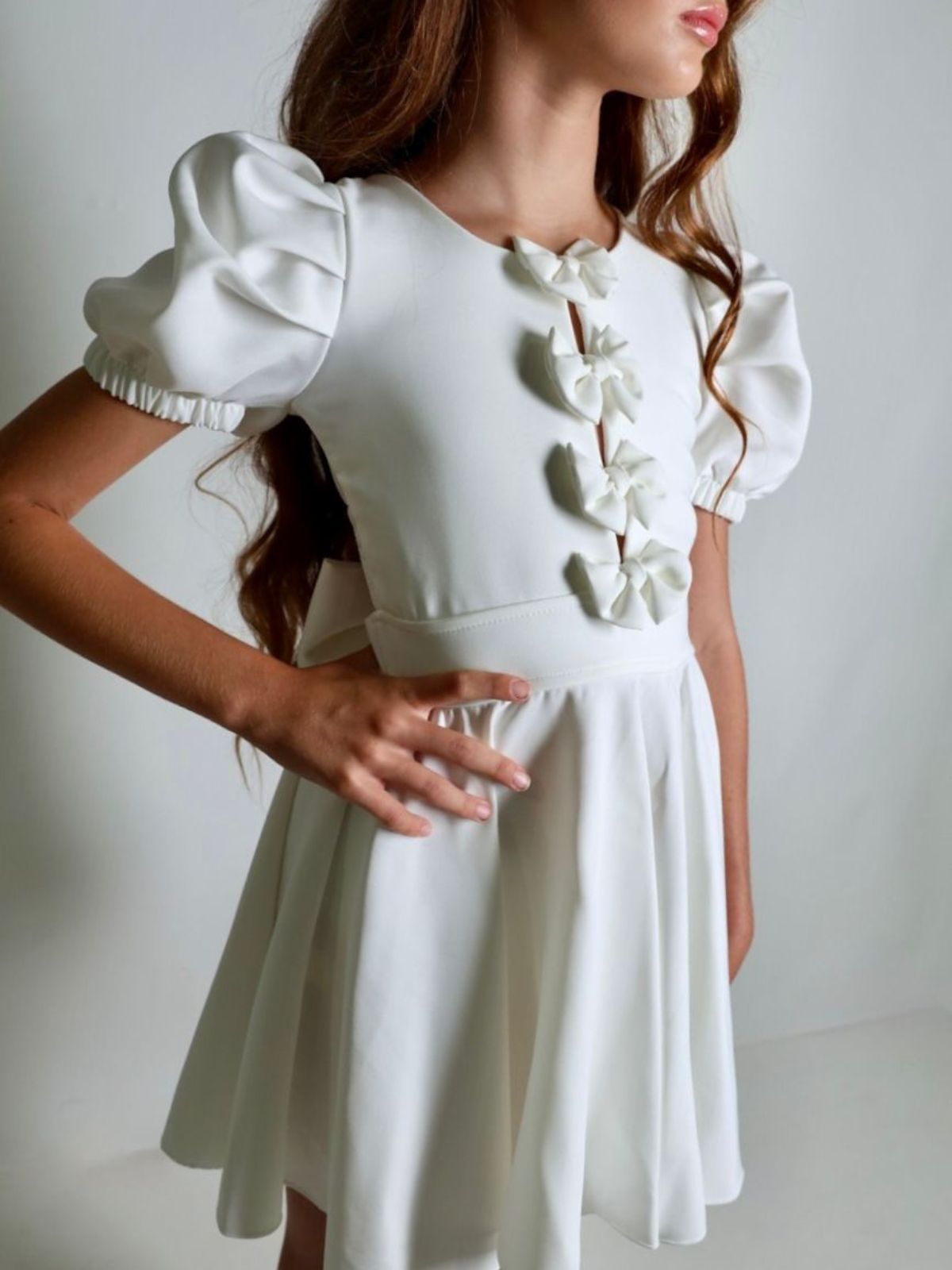 שמלה מסתובבת מבד מונקו עם עיטורי פפיוניםבחזית שרוולים תפוחים ופפיון מושלם בגב