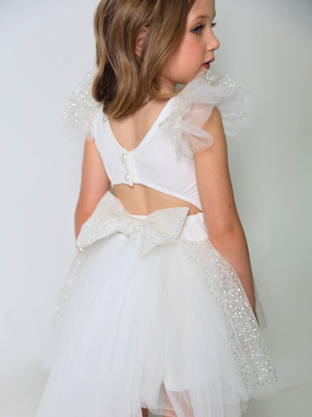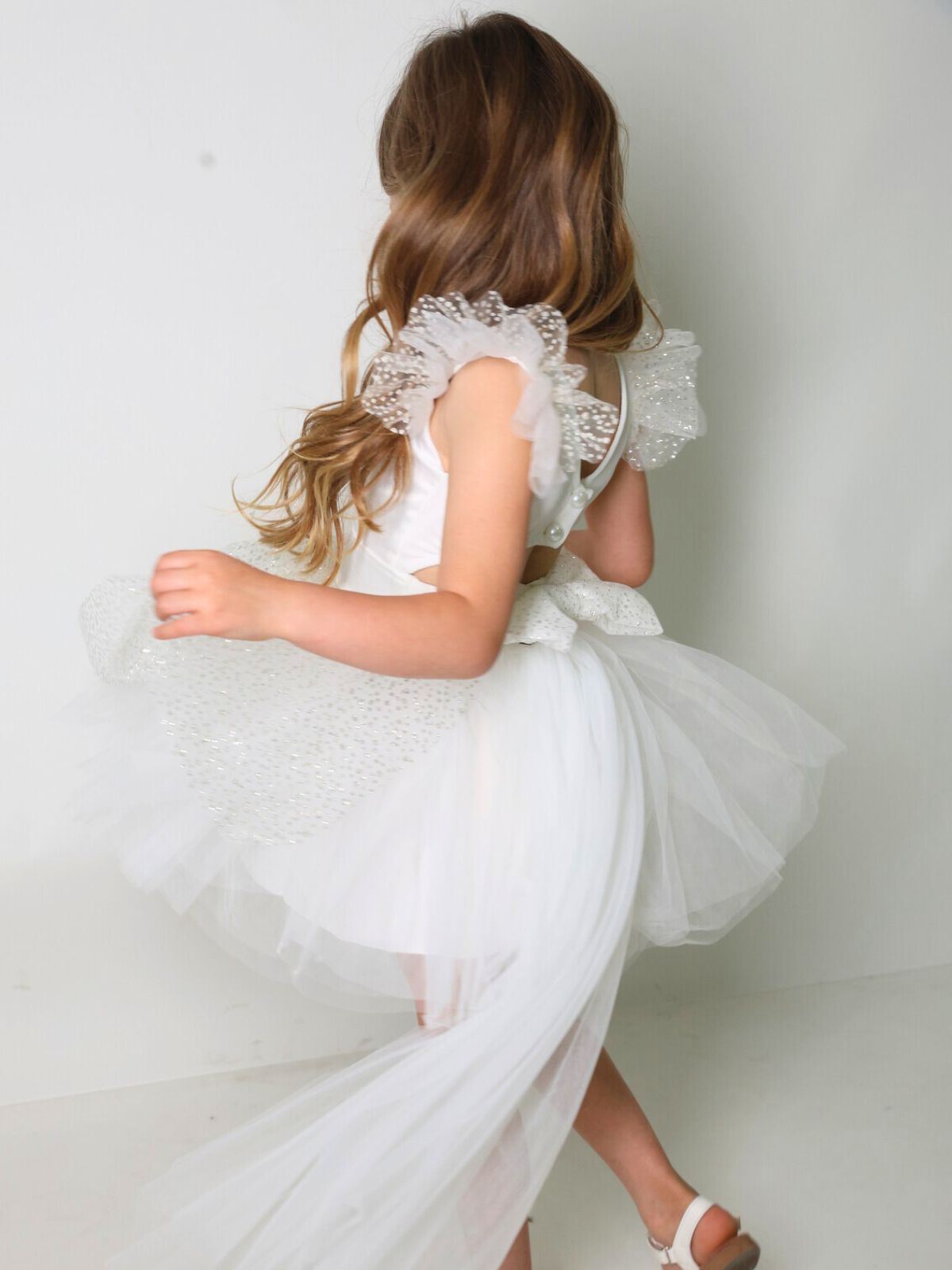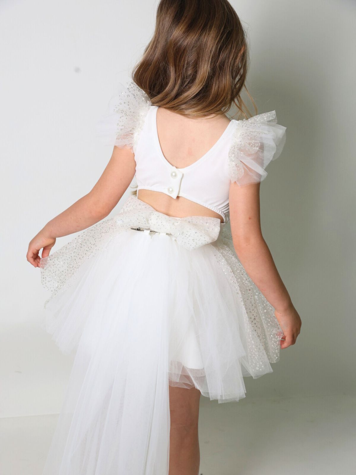 שמלת טוטו עם שובל נשלף, שניתן להסיר ולחבר מחדש, כפתורי פנינה בגב משולבת טול גליטר בכתפיות בפפיון ובחצאית.