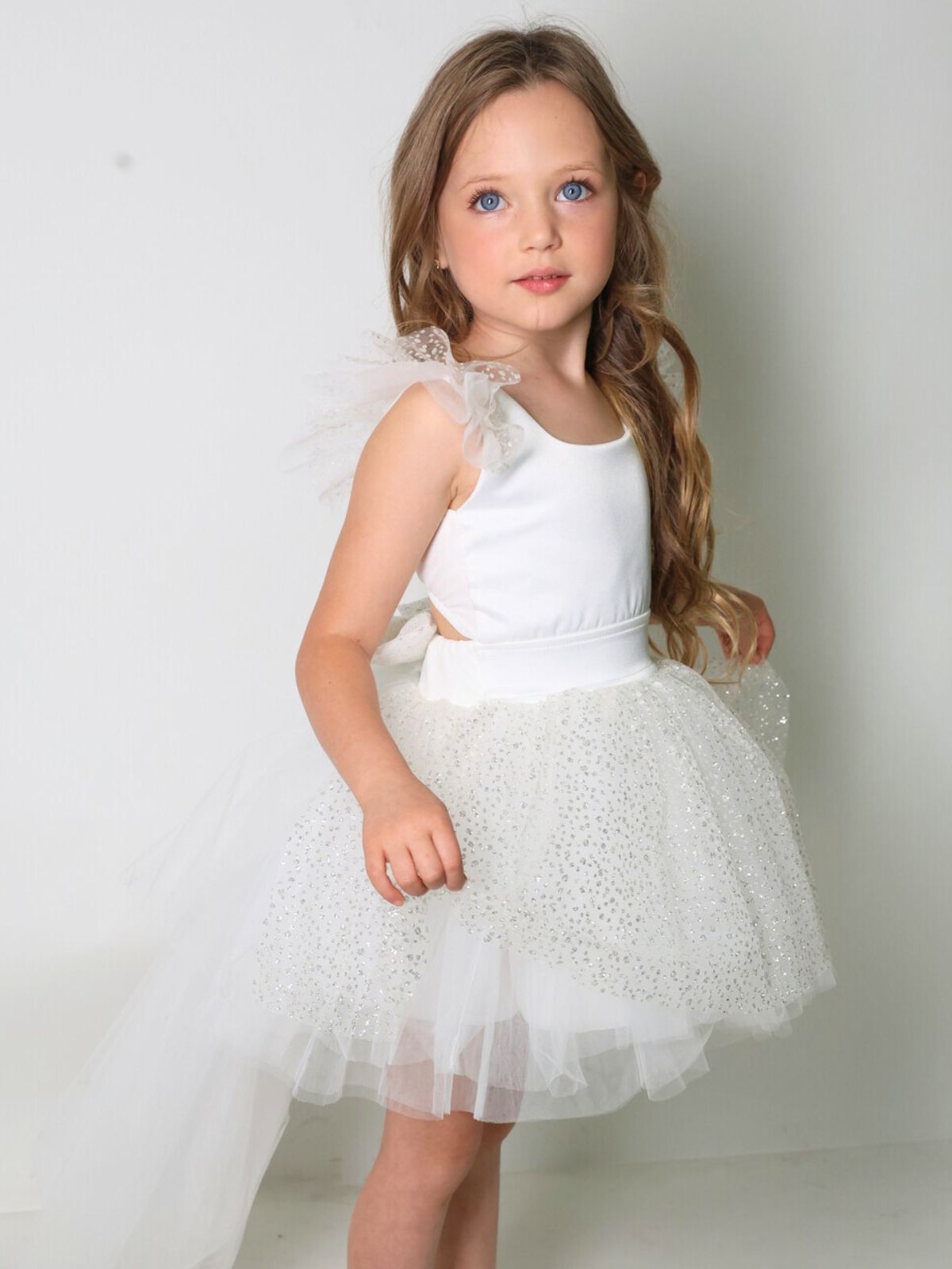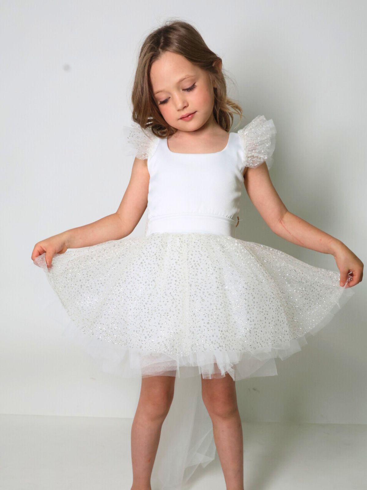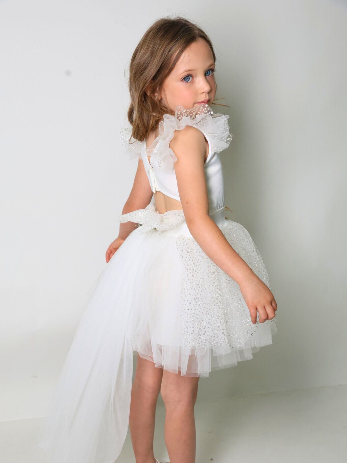 שמלת טוטו עם שובל נשלף, שניתן להסיר ולחבר מחדש, כפתורי פנינה בגב משולבת טול גליטר בכתפיות בפפיון ובחצאית.