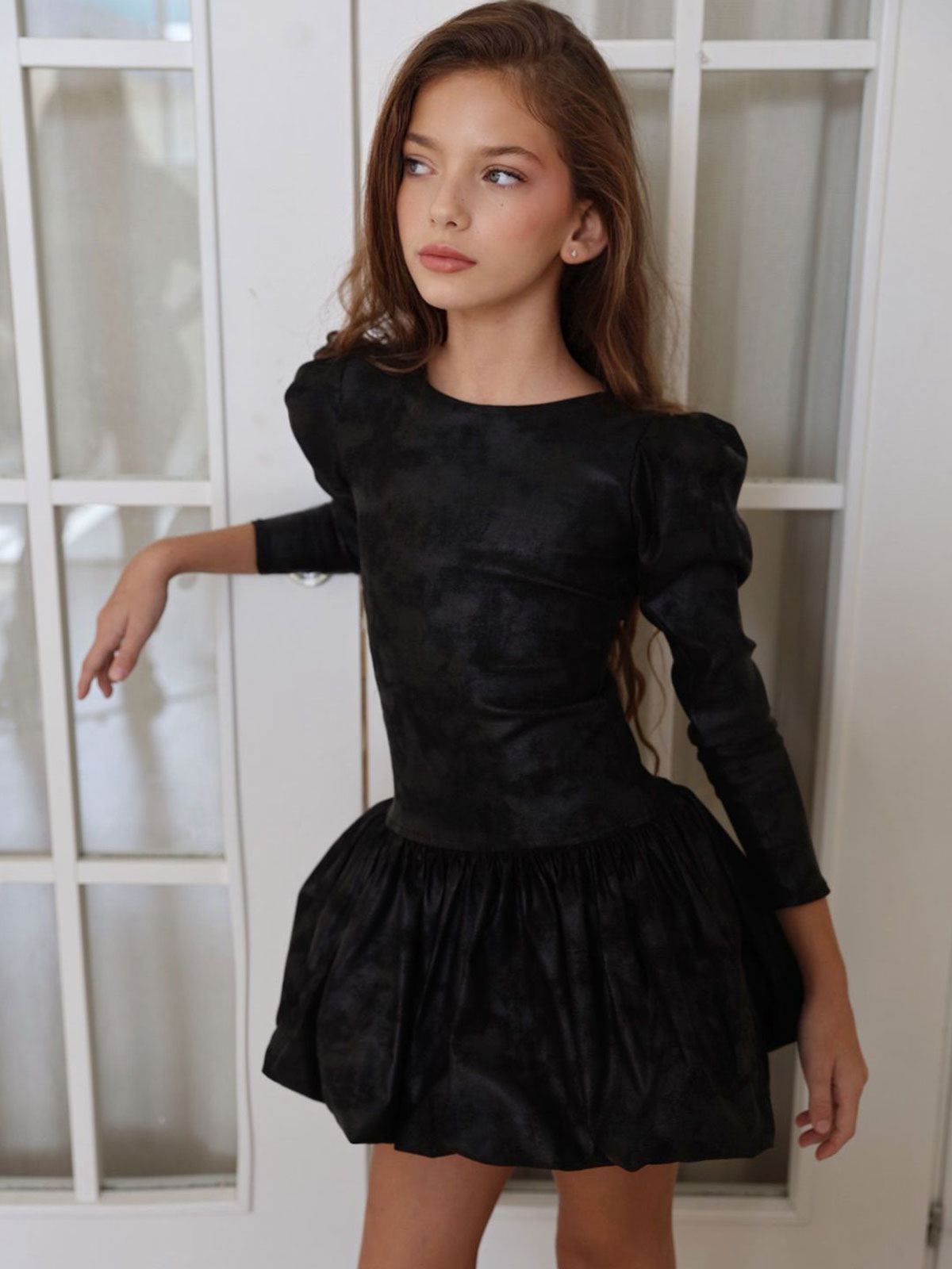 שמלת בלון מבד דמוי עור מרוח עם מתיחה, שרוולים תפוחים, שמלה נוחה ומחמיאה