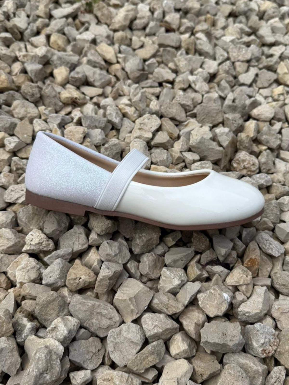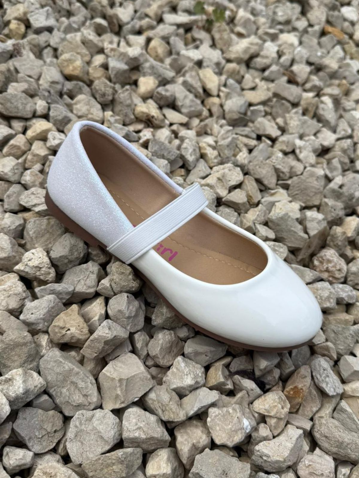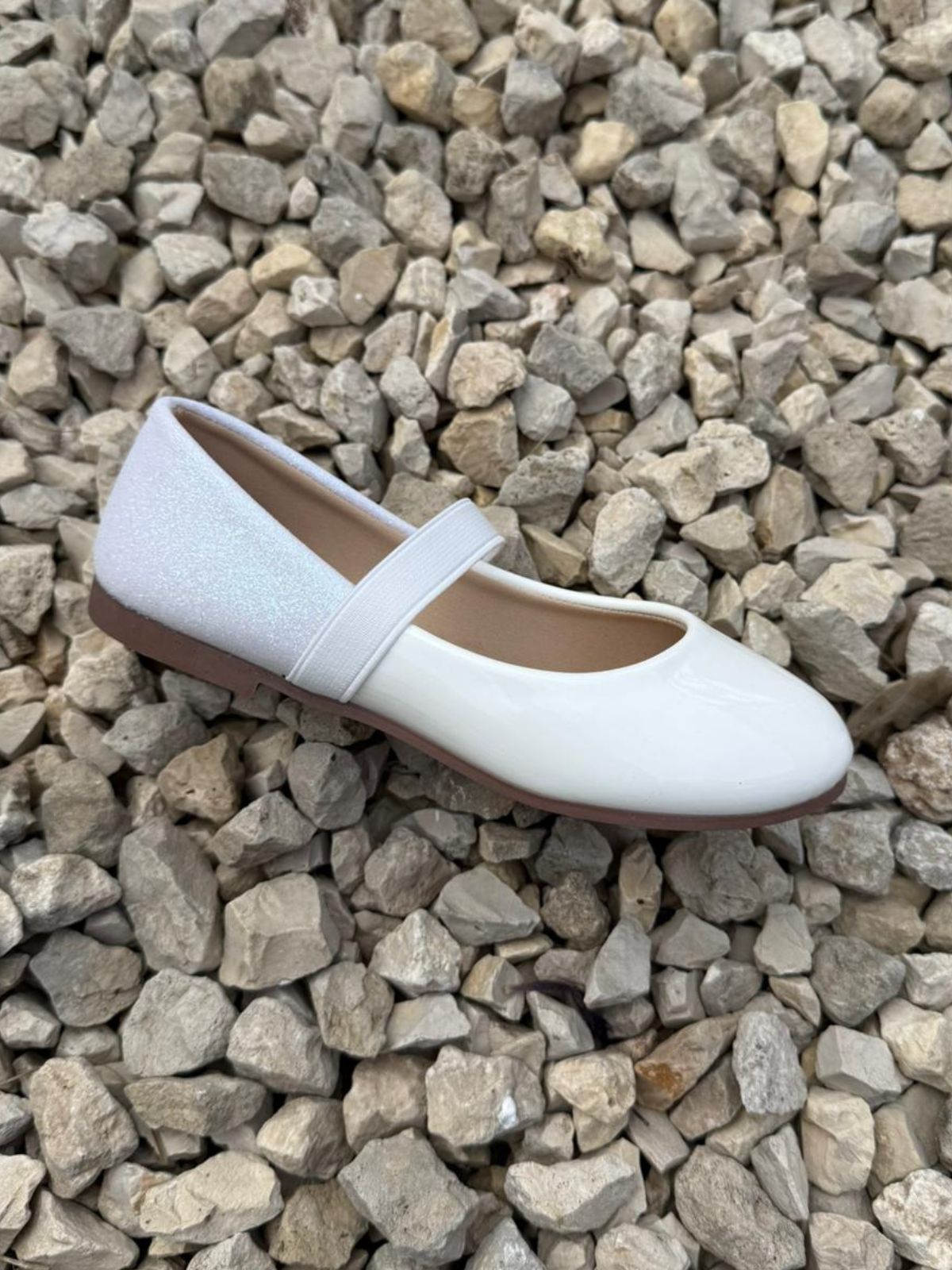 נעל בובה לבנה ועדינה עם רצועת גומי אלגנטית בחלק העליון. החלק האחורי מעוטר בטקסטורה עדינה ומנצנצת שמוסיפה טאץ’ חגיגי, והסוליה בגוון טבעי מעניקה מראה נקי וקלאסי. מתאימה לאירועים, חגים או לכל יום שבו רוצים לוק מוקפד ומתוק במיוחד.