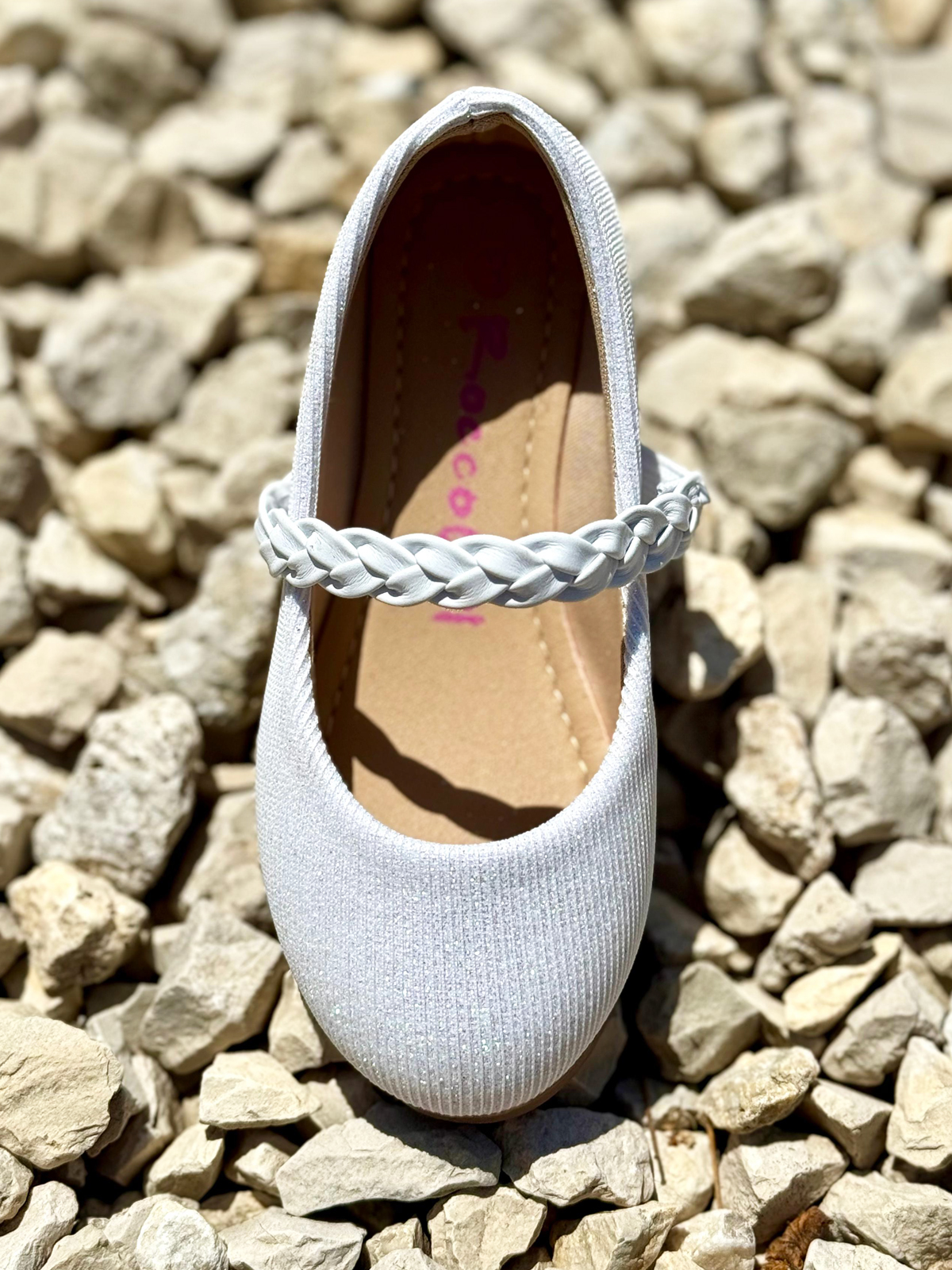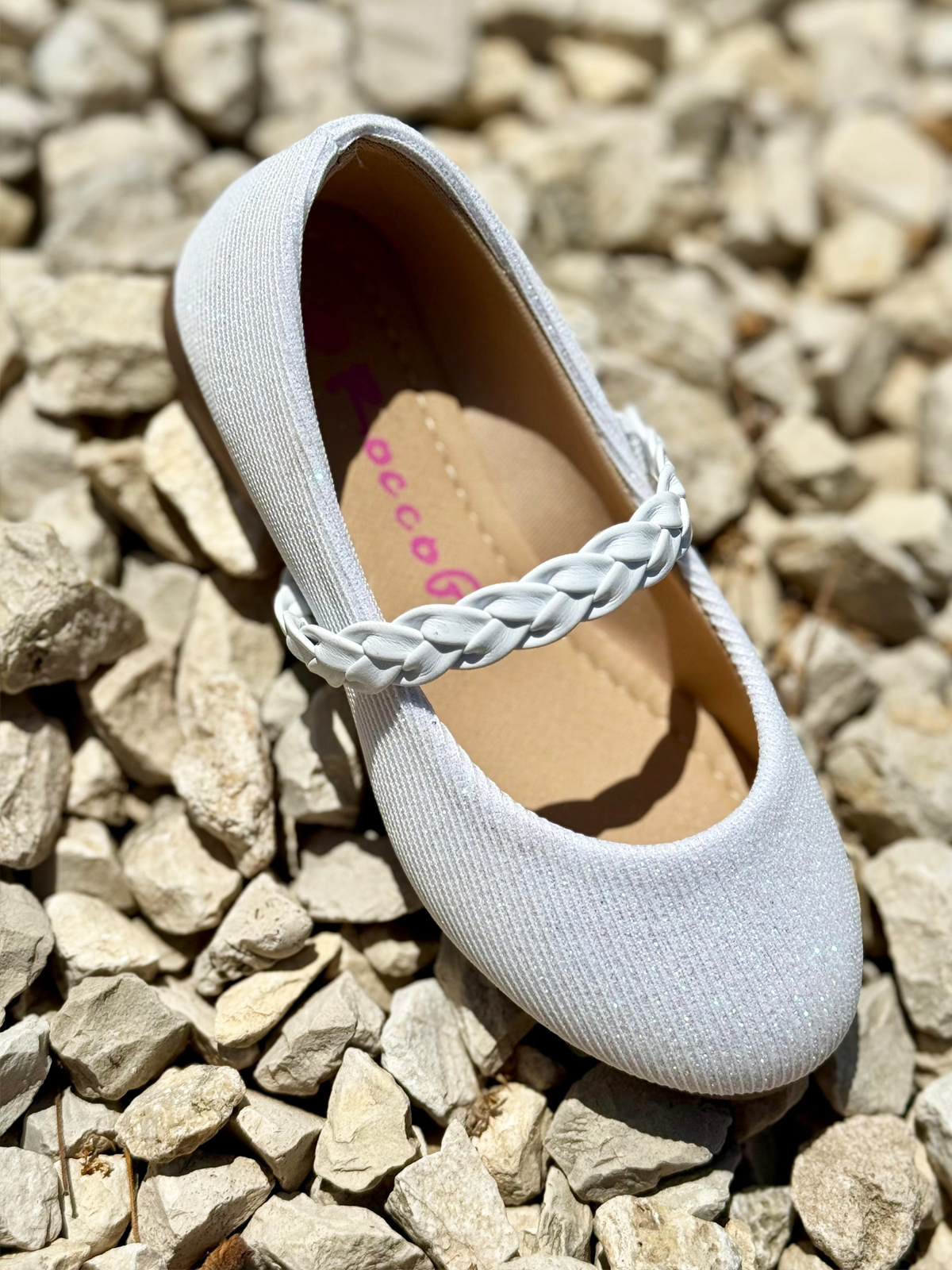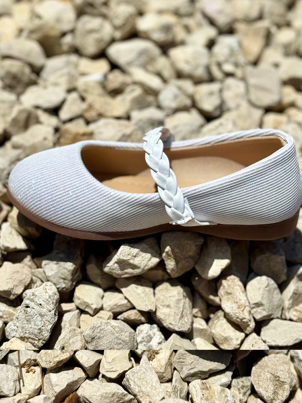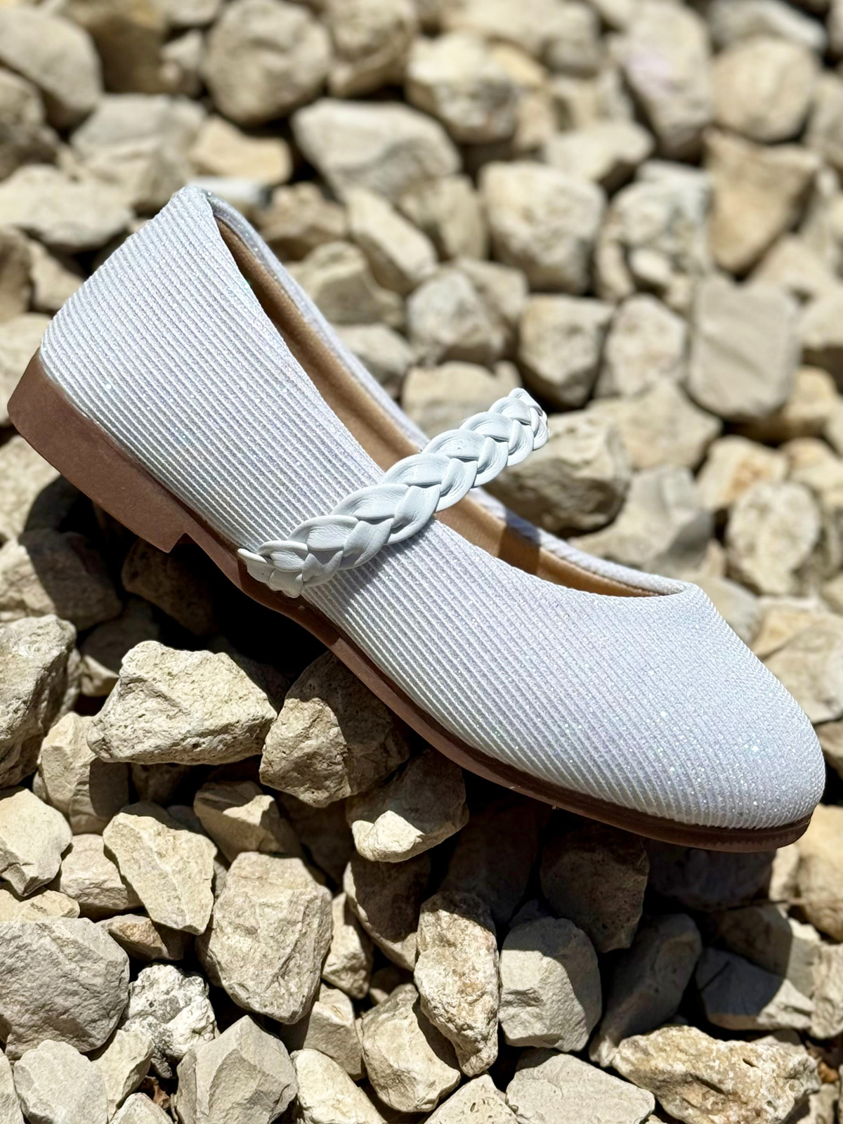 נעל בובה אלגנטית וקלאסית לילדות, בצבע לבן עדין עם נצנוץ קל שמעניק לה מראה חגיגי ומיוחד.
