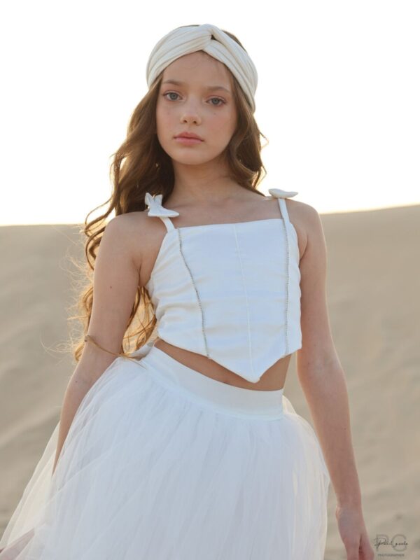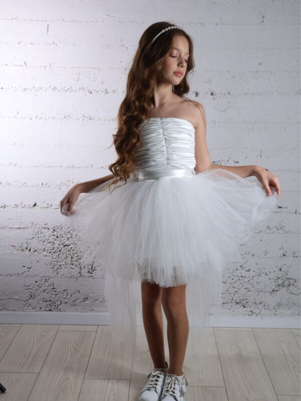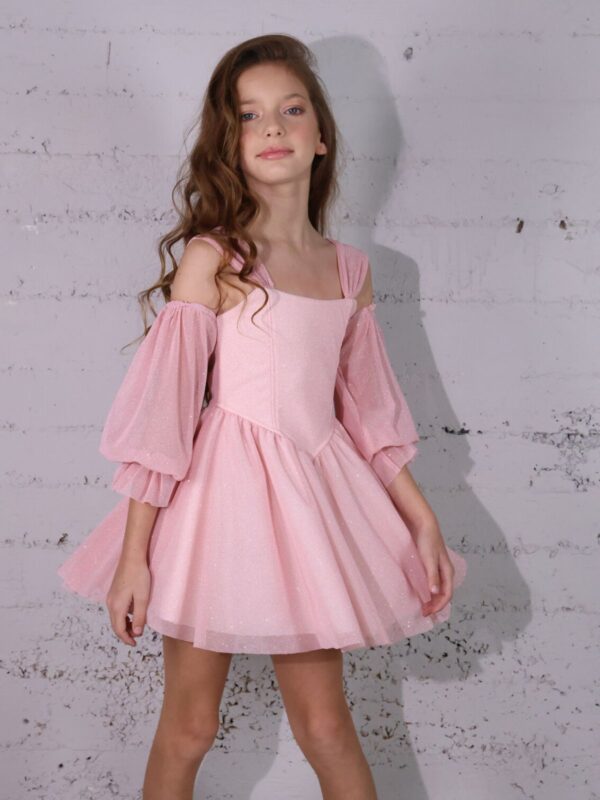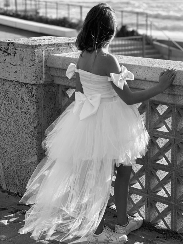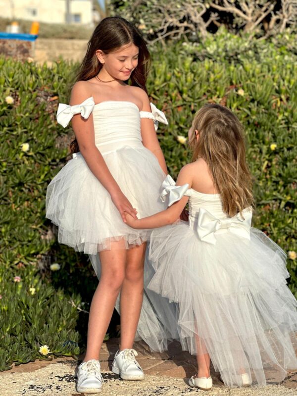 מחפשת שמלת שושבינה מושלמת לילדה? שמלה מסתובבת מבד פודנש בוהק ויוקרתי, שרוולים תפוחים, כפתורי פנינה בגב עם פפיון גדול ומושלם מיוצרת בתפירה עילית, תוצרת כחול לבן.