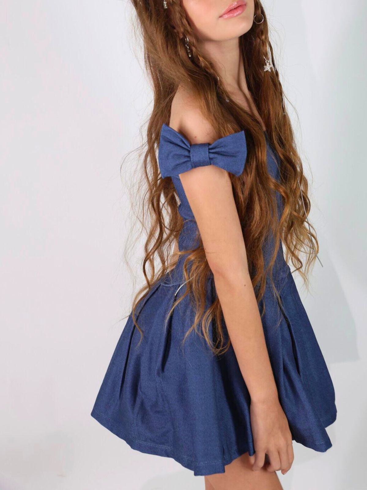 שמלת ג’ינס מסתובבת מתופרת בגזרה חובקת כתפיים עם פפיונים