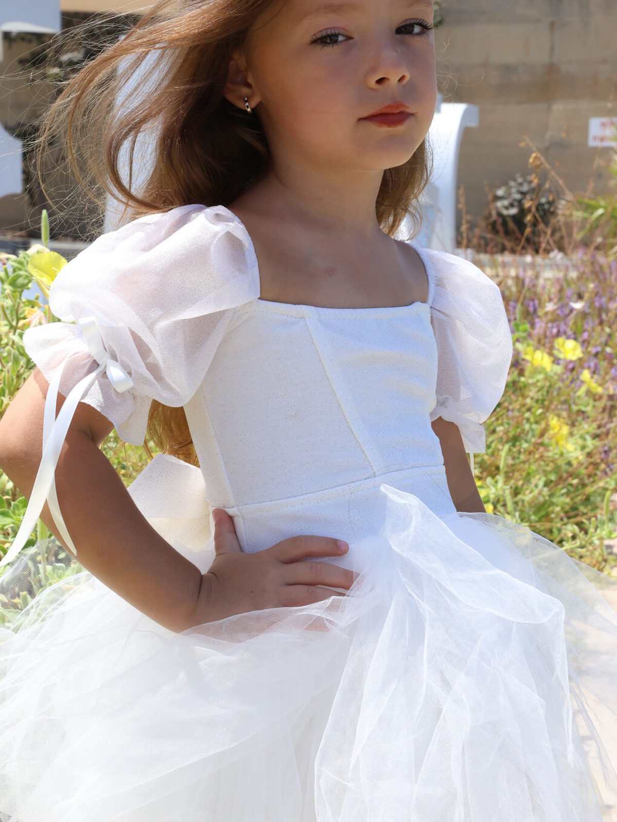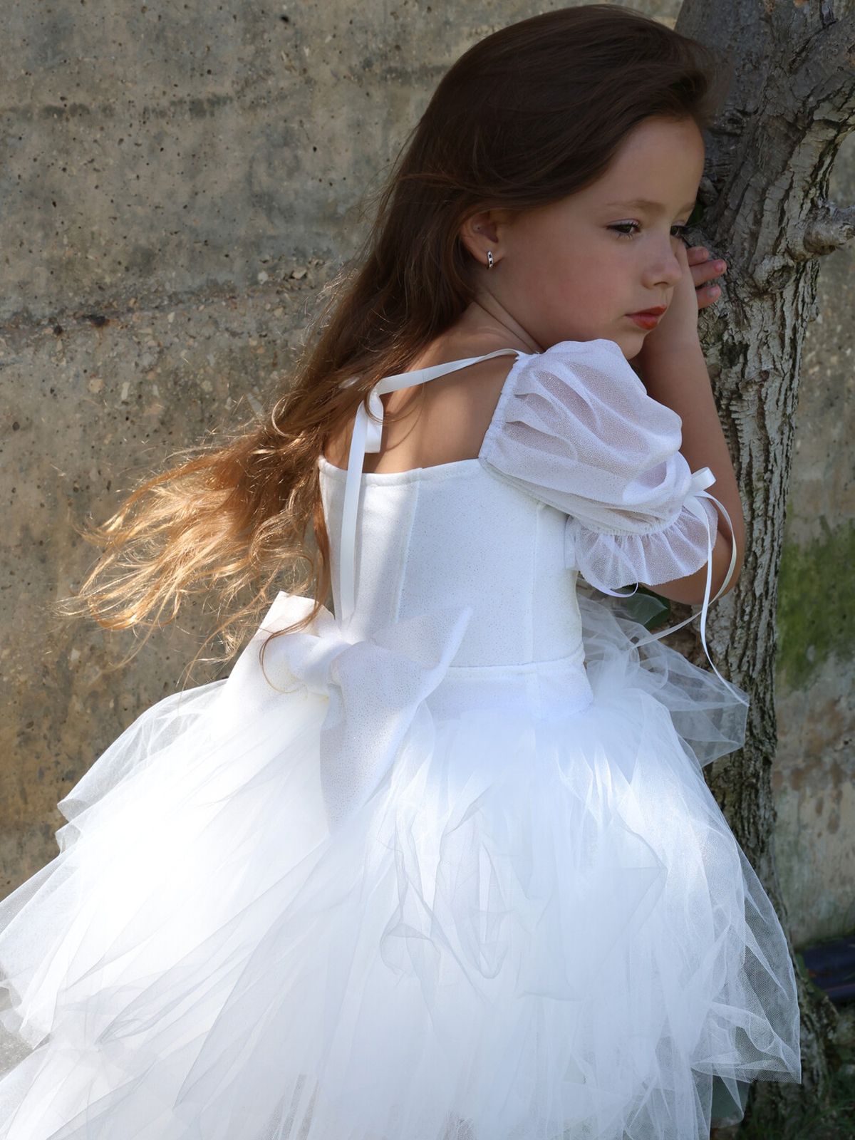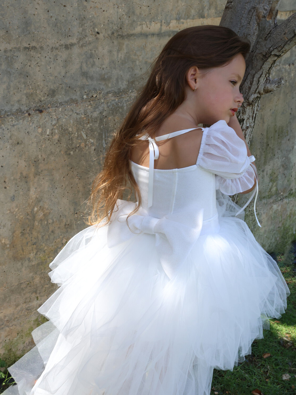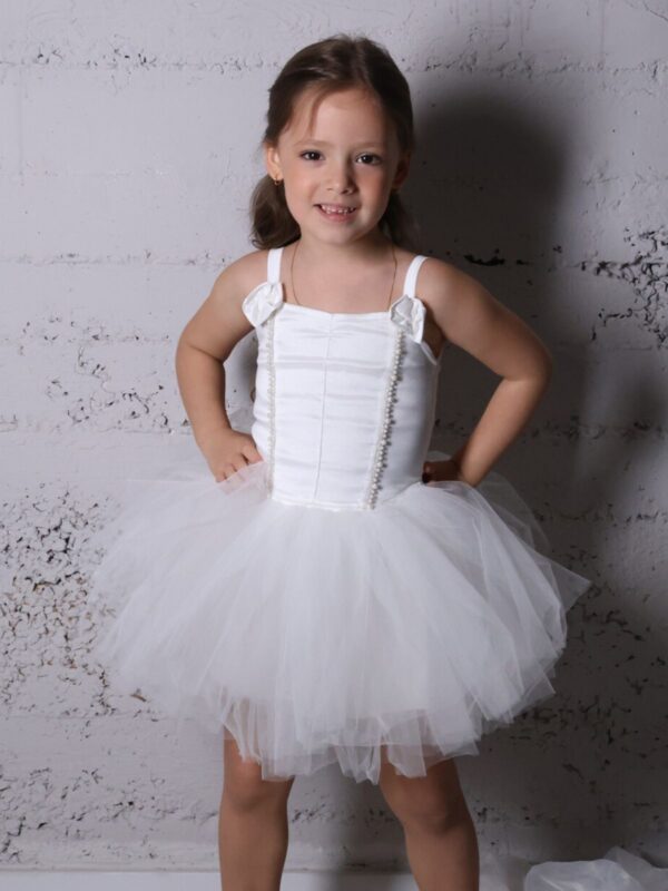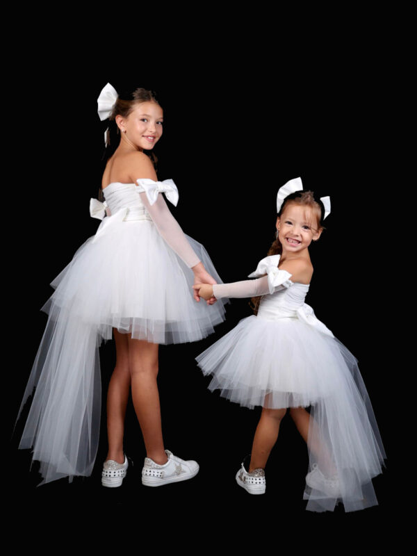 שמלת טוטו מטול מנצנץ עם שרוולים תפוחים עם כיווץ ופפיון סרט סטן, תיפורים בחזה, פפיון ענק ומושלם בגב עם שובל טול ארוך ללוק שגונב את ההצגה
