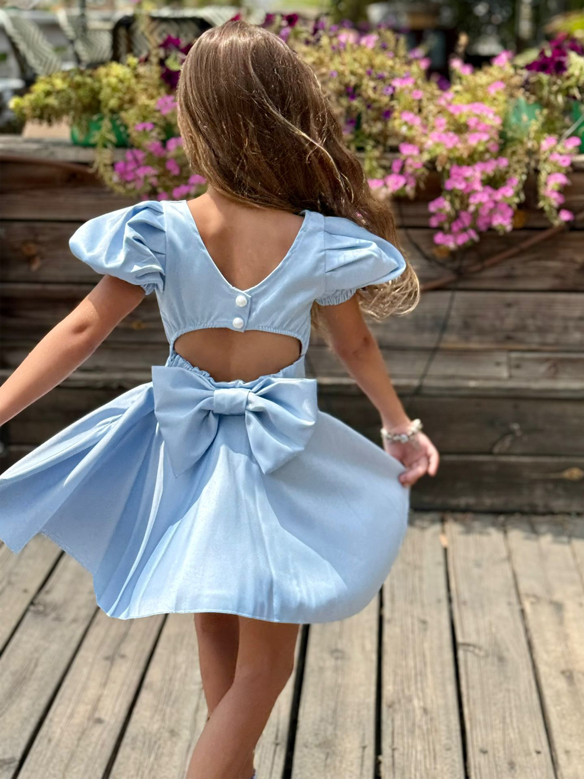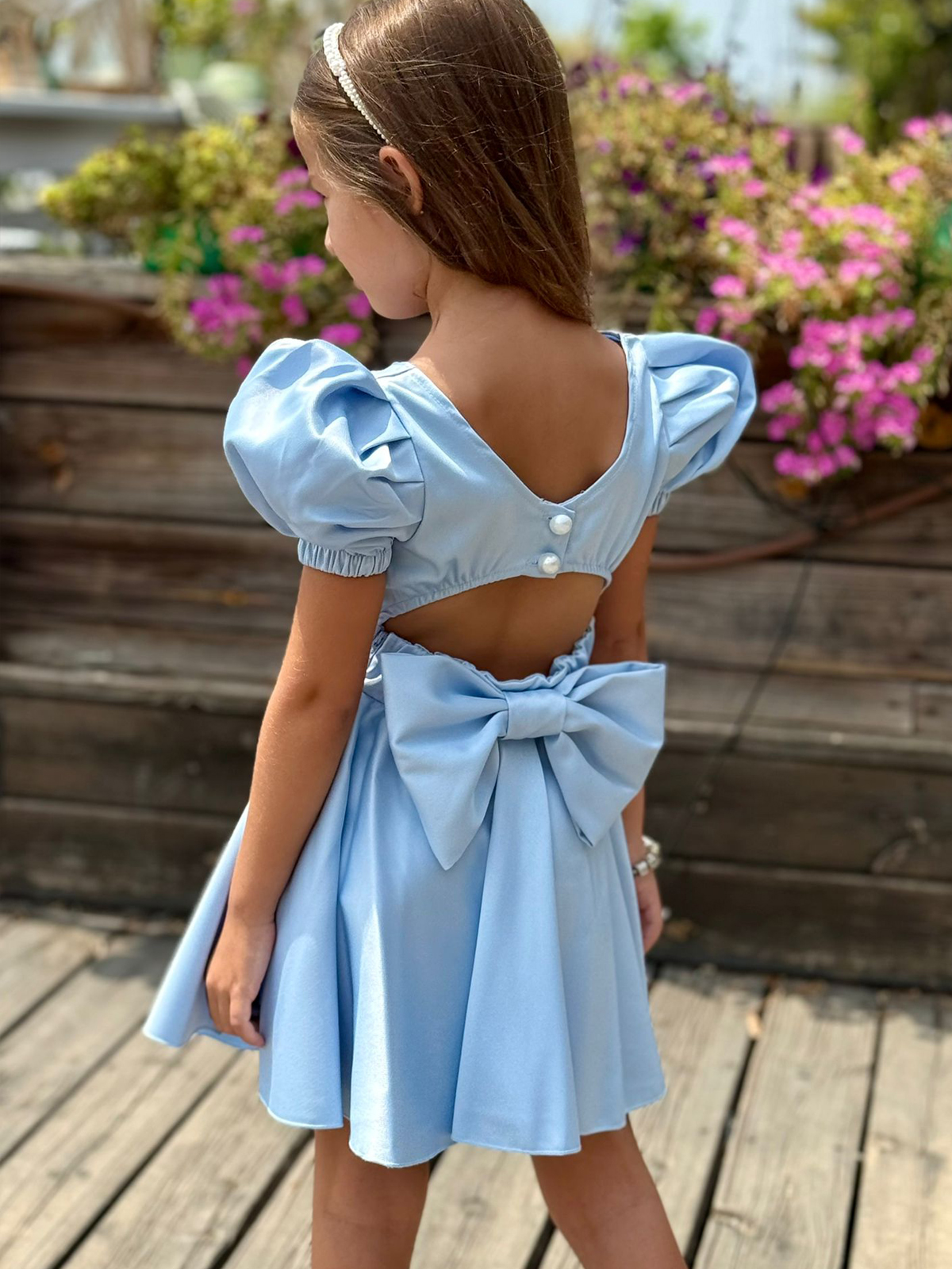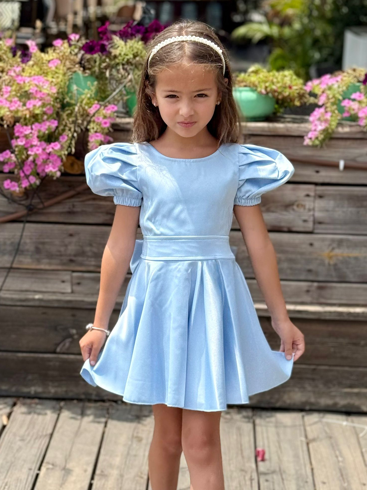 מחפשת שמלת שושבינה מושלמת לילדה? שמלה מסתובבת מבד פודנש בוהק ויוקרתי, שרוולים תפוחים, כפתורי פנינה בגב עם פפיון גדול ומושלם מיוצרת בתפירה עילית, תוצרת כחול לבן.