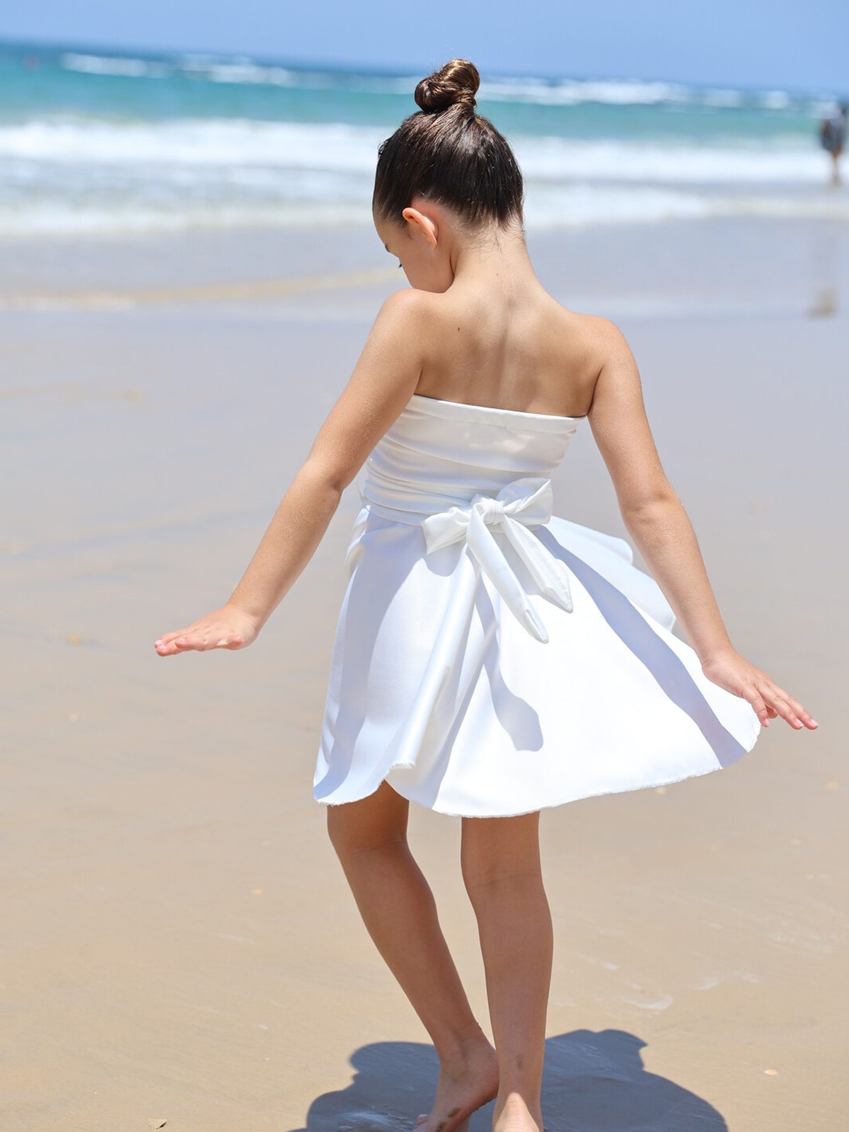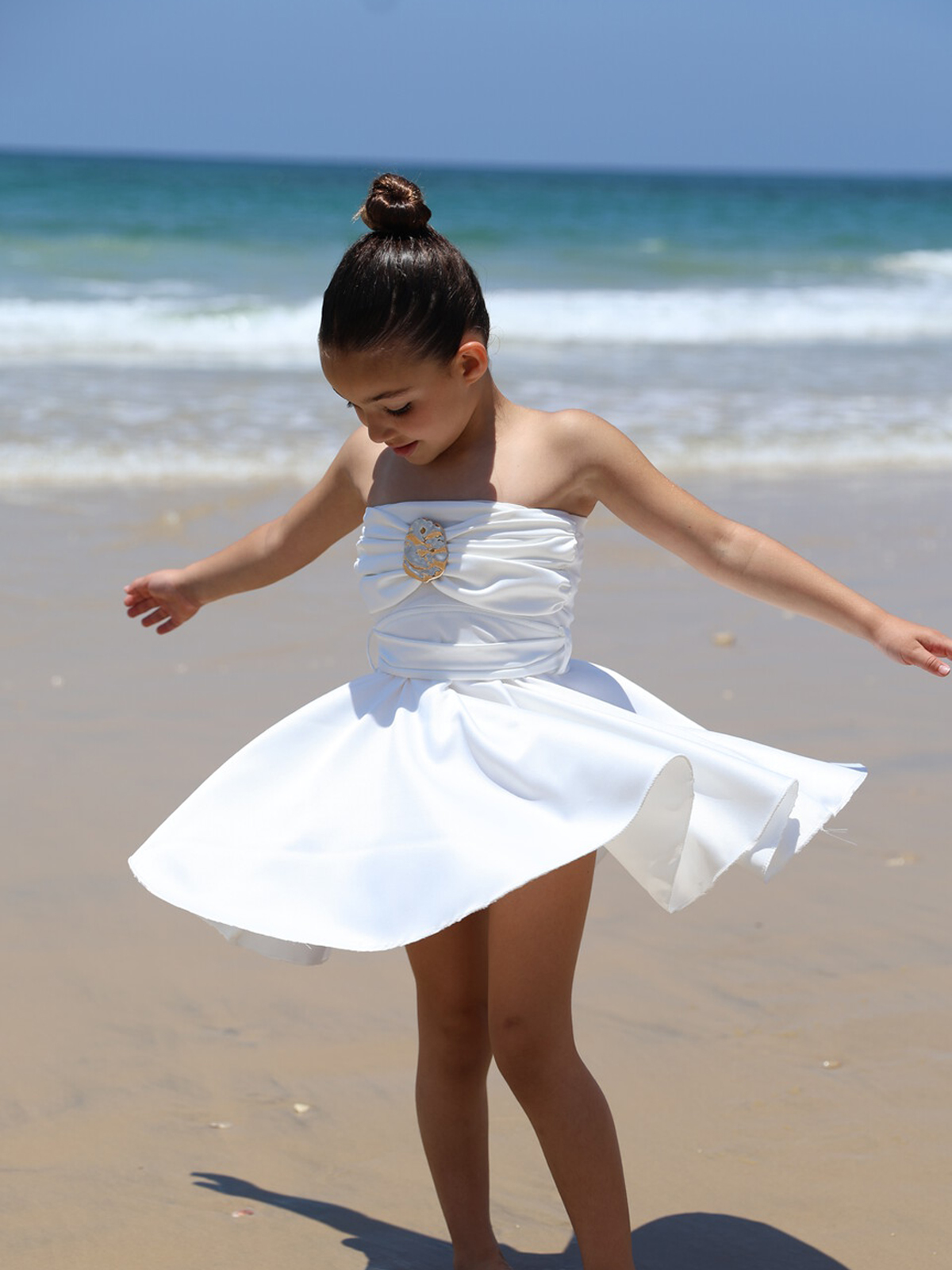 שמלה בגזרת סטרפלס מסתובבת, בשילוב אבזם מוזהב עם קשירה בגב מבד פודנש בוהק וחגיגי