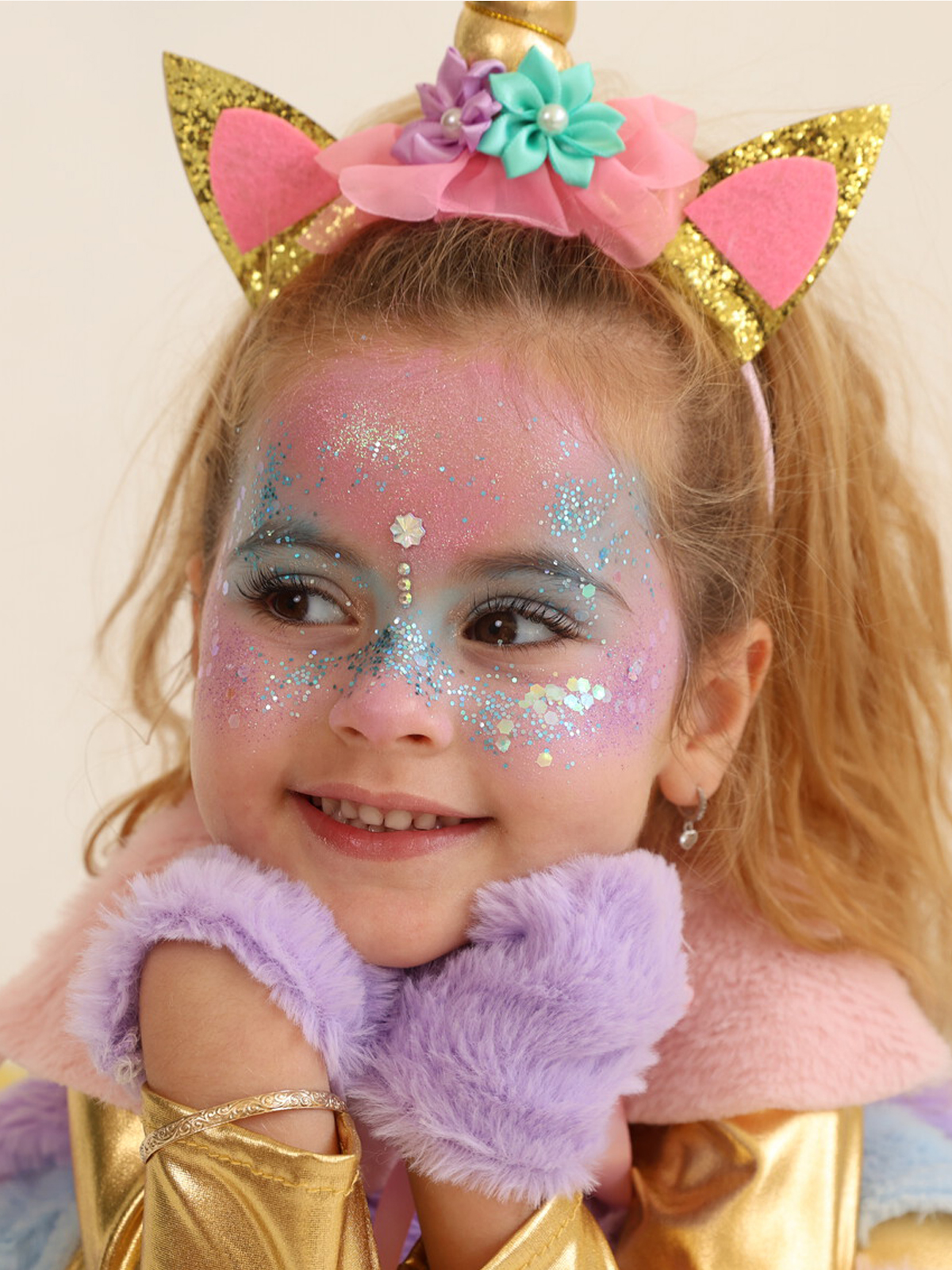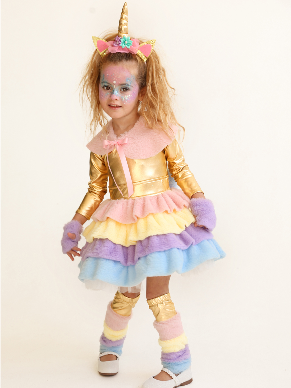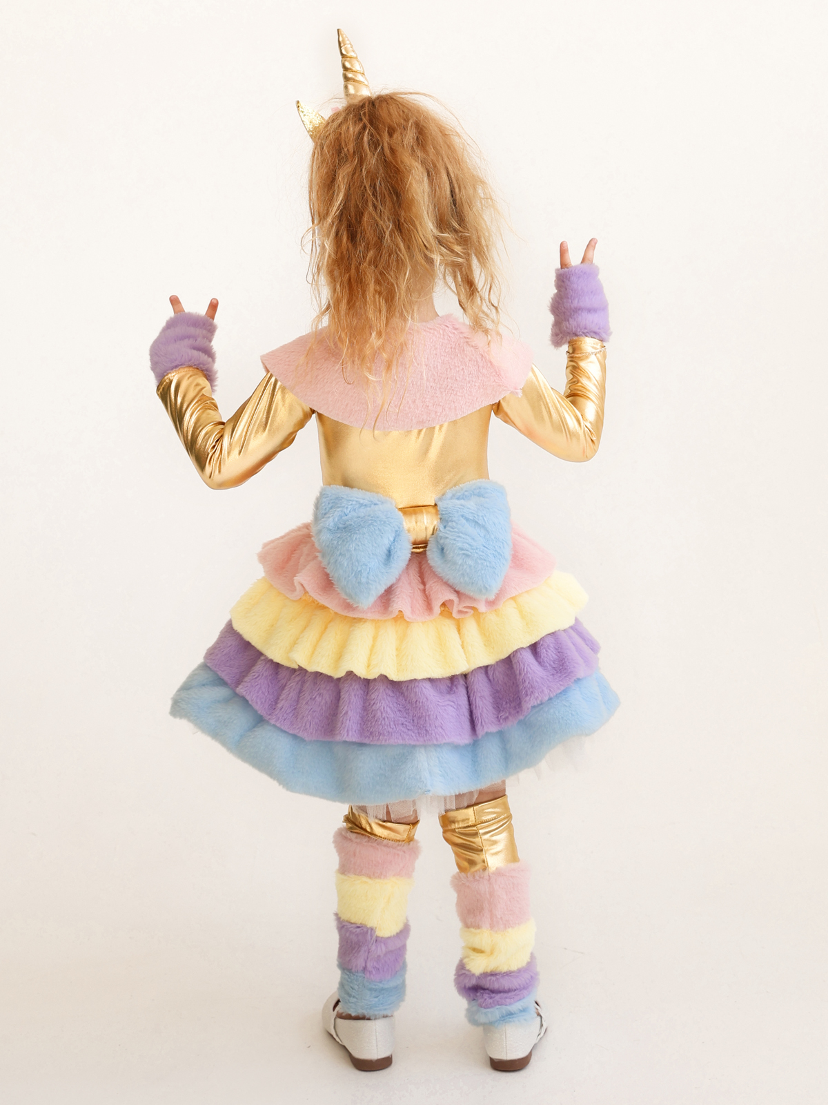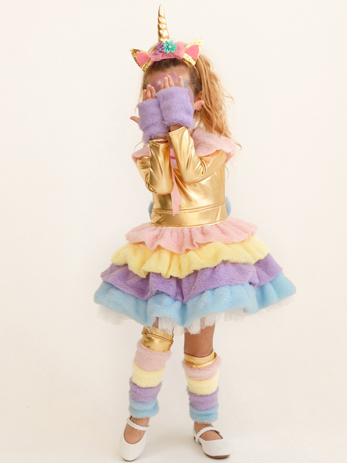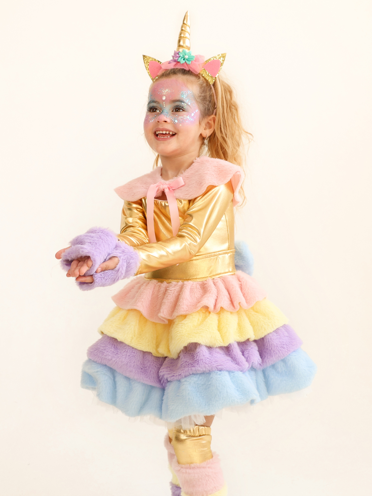 תחפושת יוניקורן כוללת שמלת טוטו קומות פרווה בשילוב בד פוייל מוזהב.