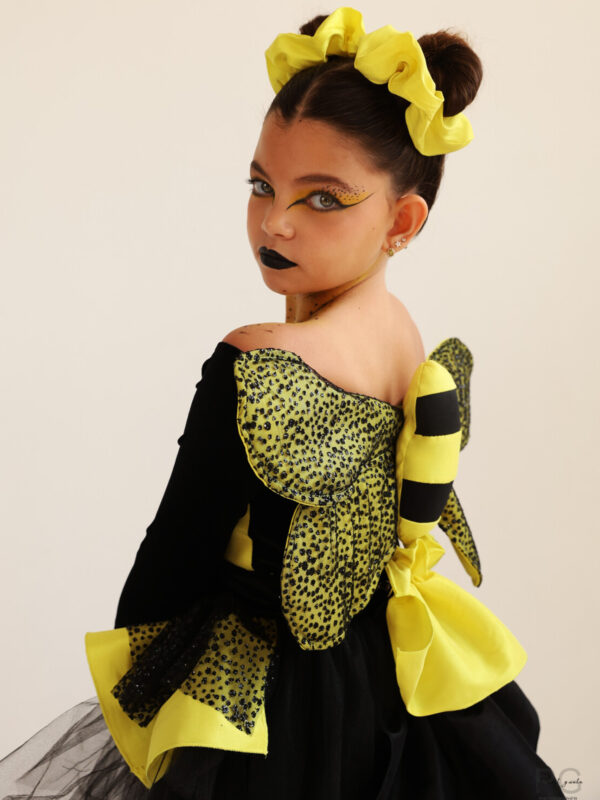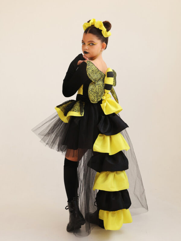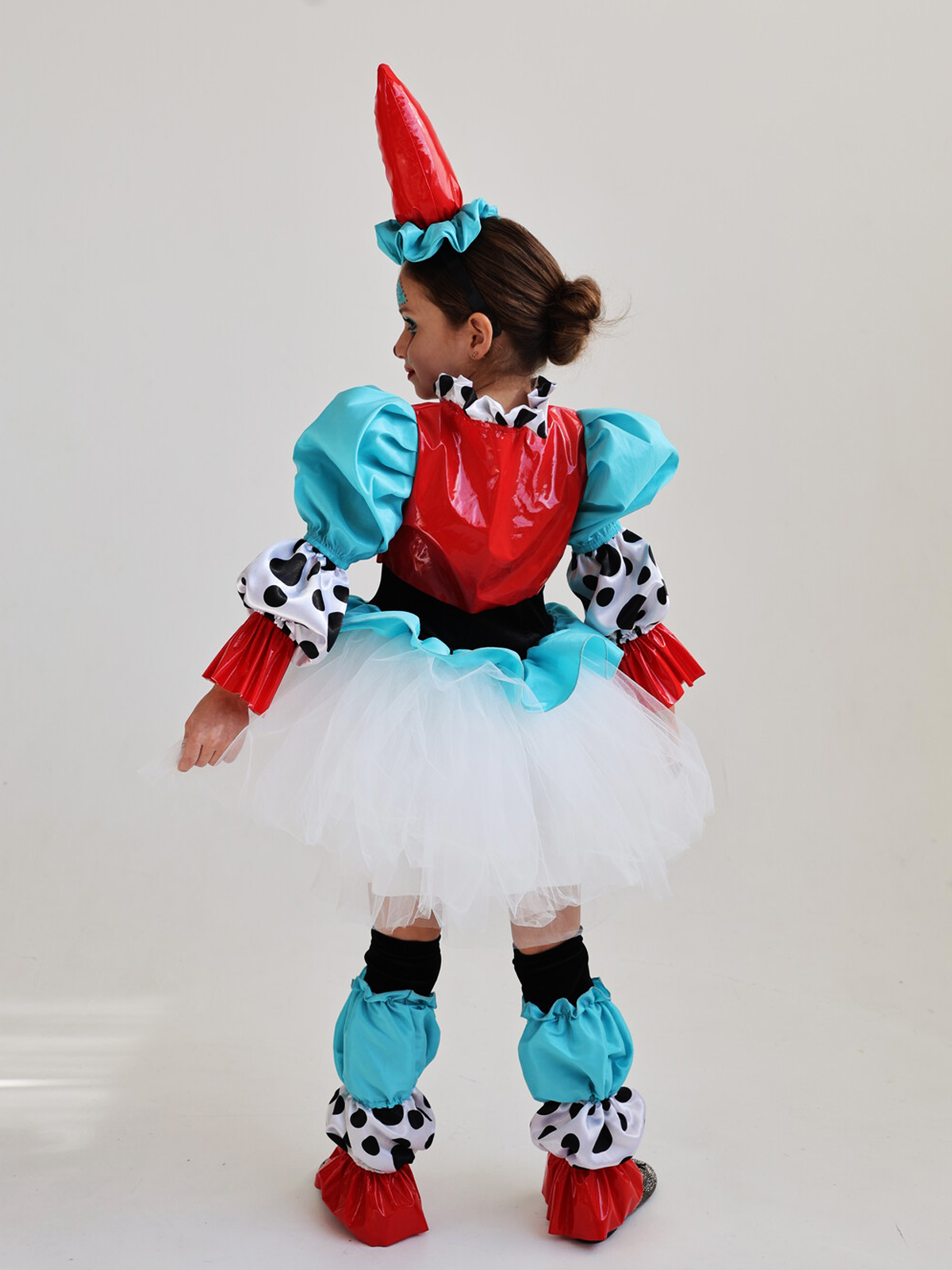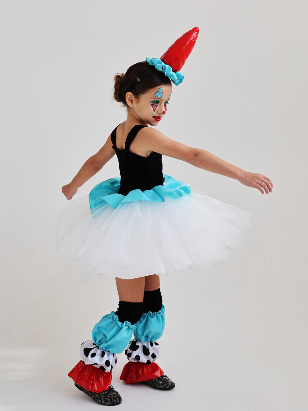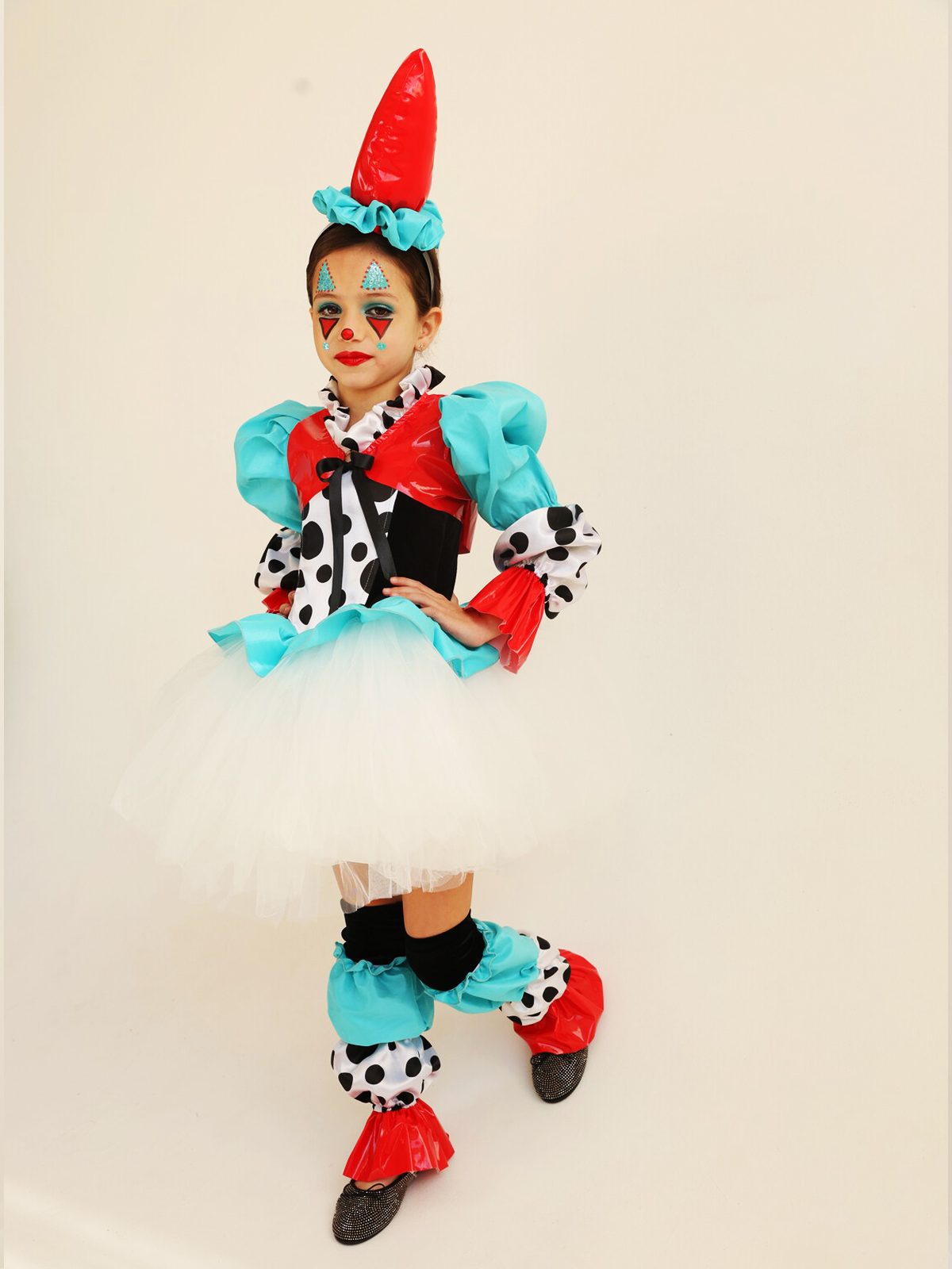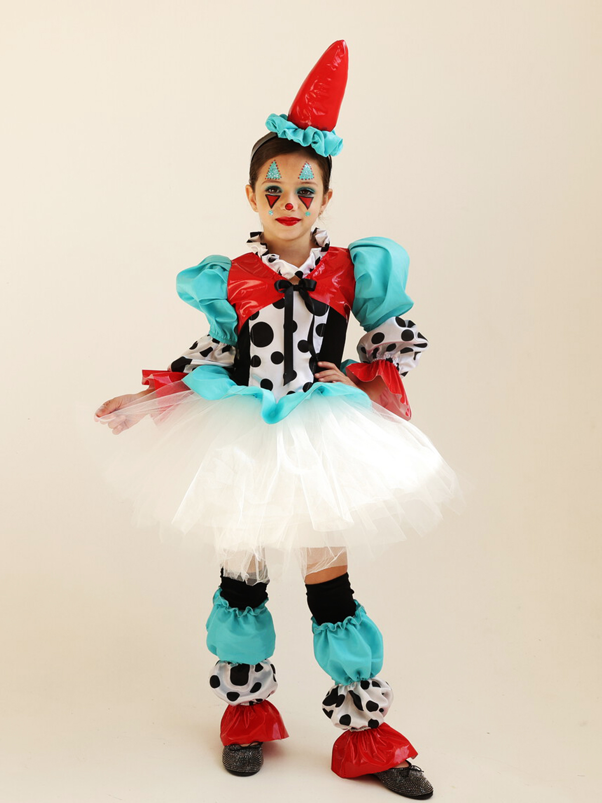 תחפושת ליצנית לילדה כוללת: שמלת טוטו בשילוב קטיפה מנוקדת, ג׳קט וויניל עם שרוולים תפוחים.
