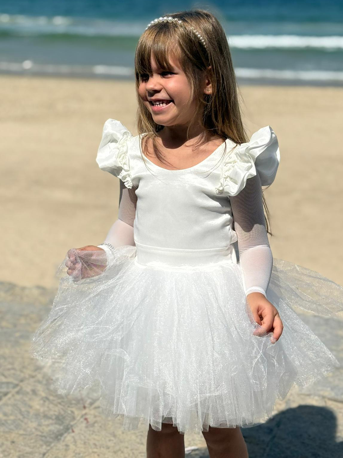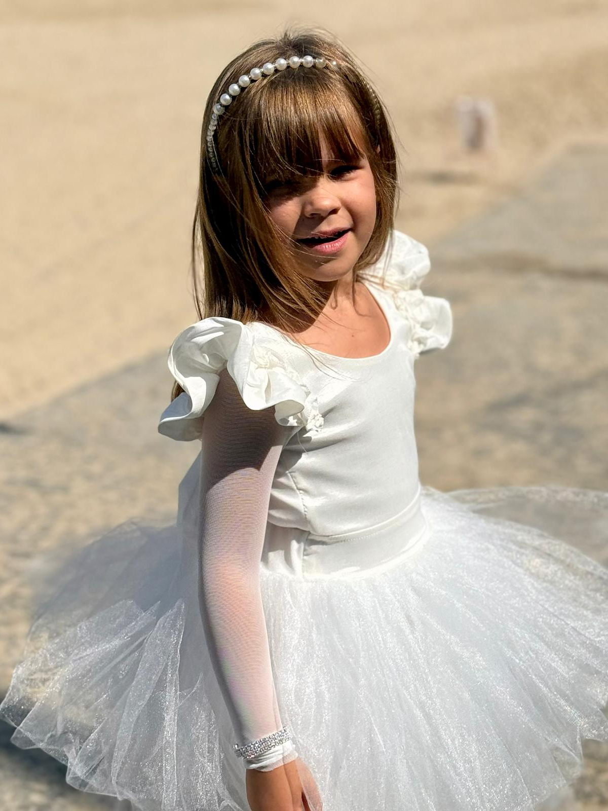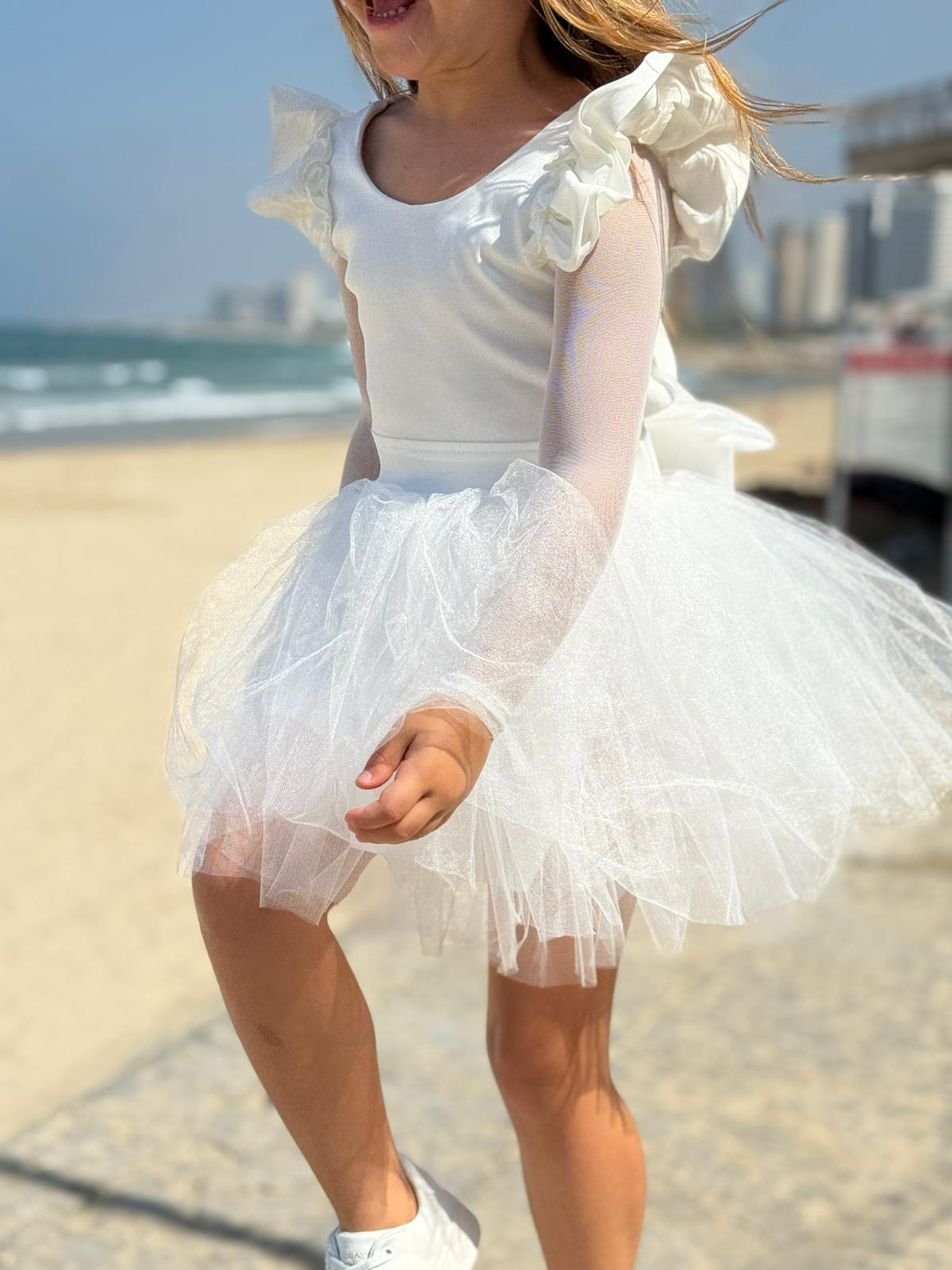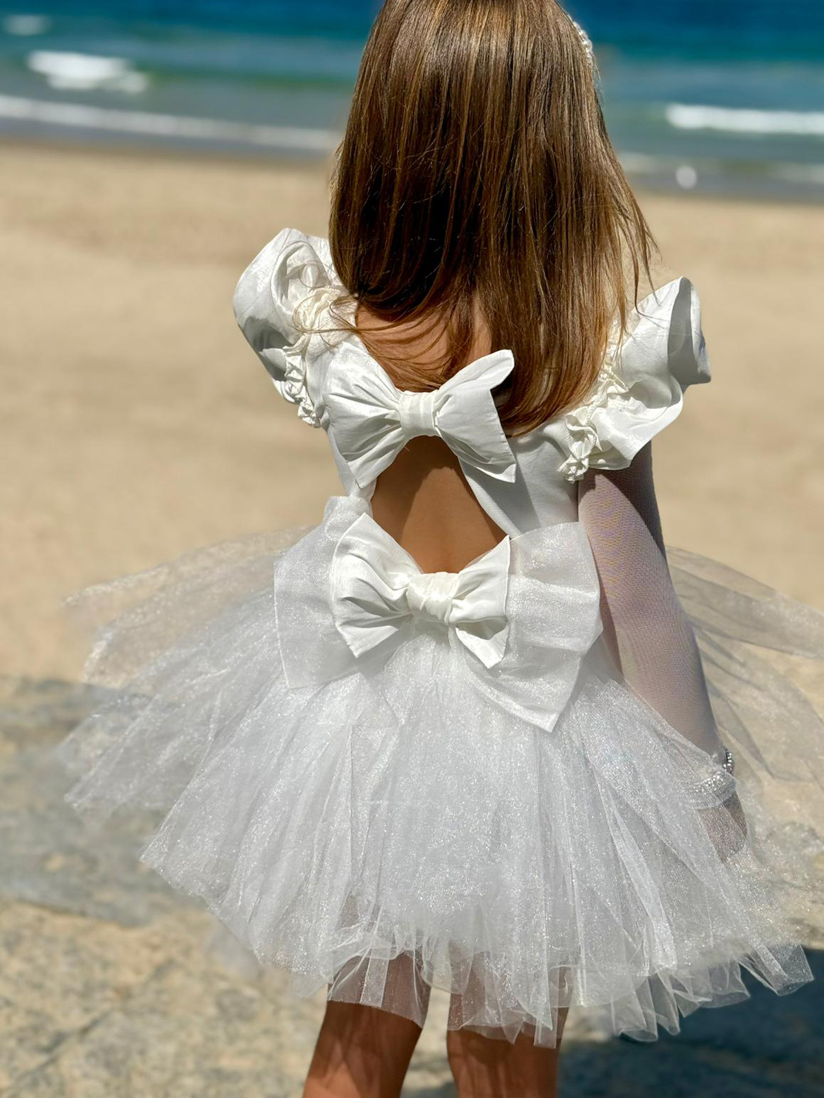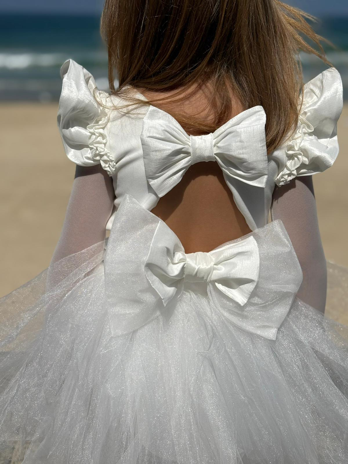 שמלת שושבינה טוטו קלאסית משולבת בד טפט, שרוולי כנפיים וטול שיפון לייקרה דקיקים ועדינים, פפיונים משולבים ומעוצבים בגב.