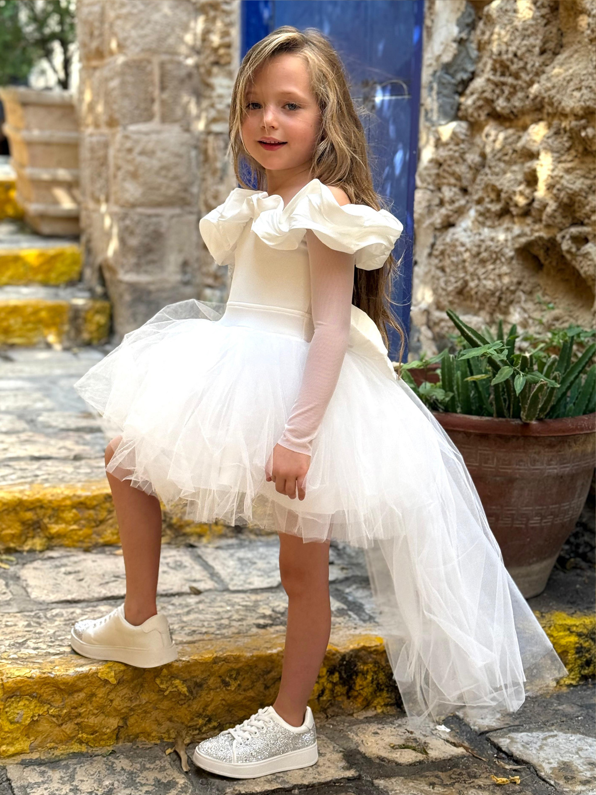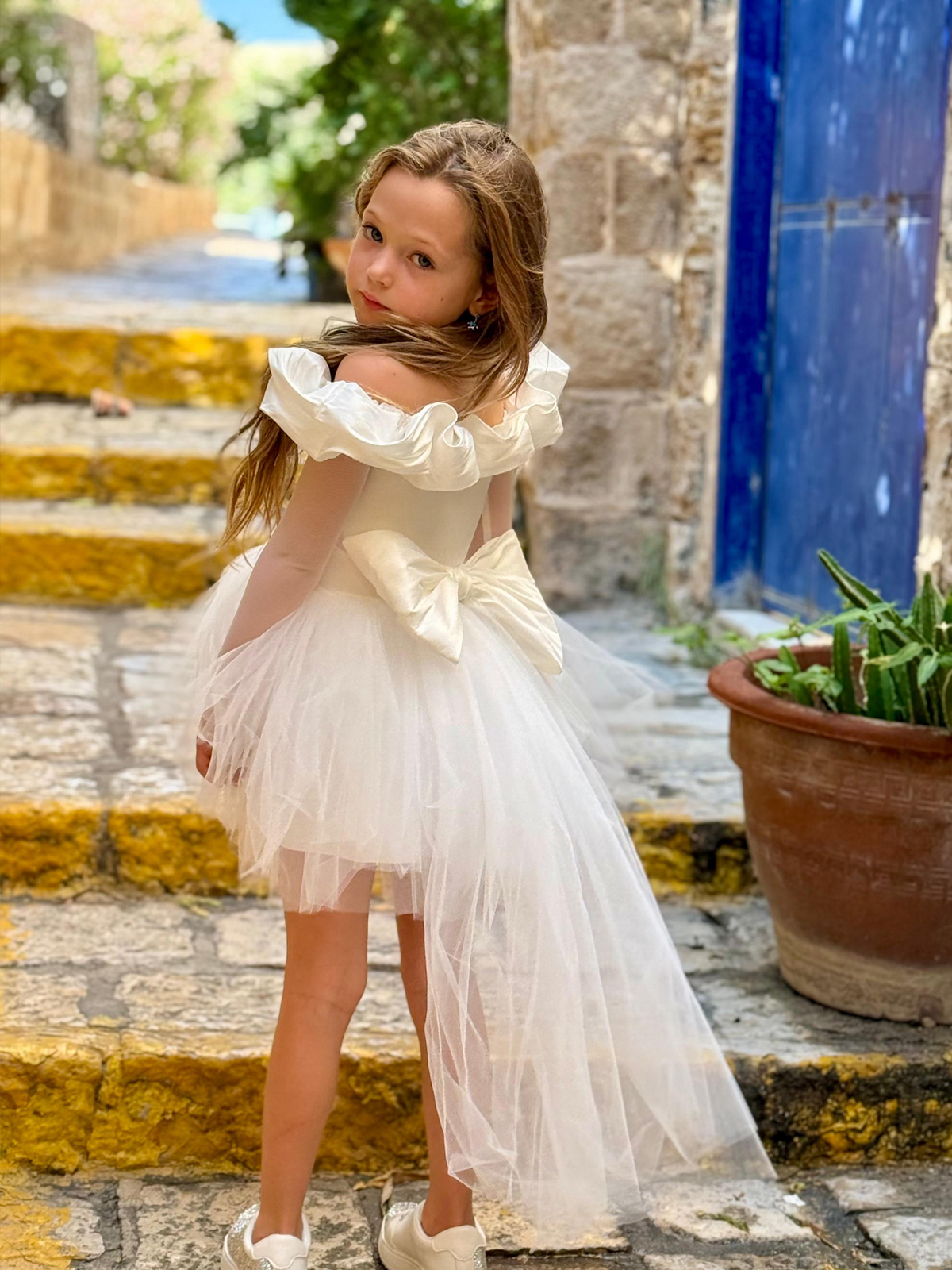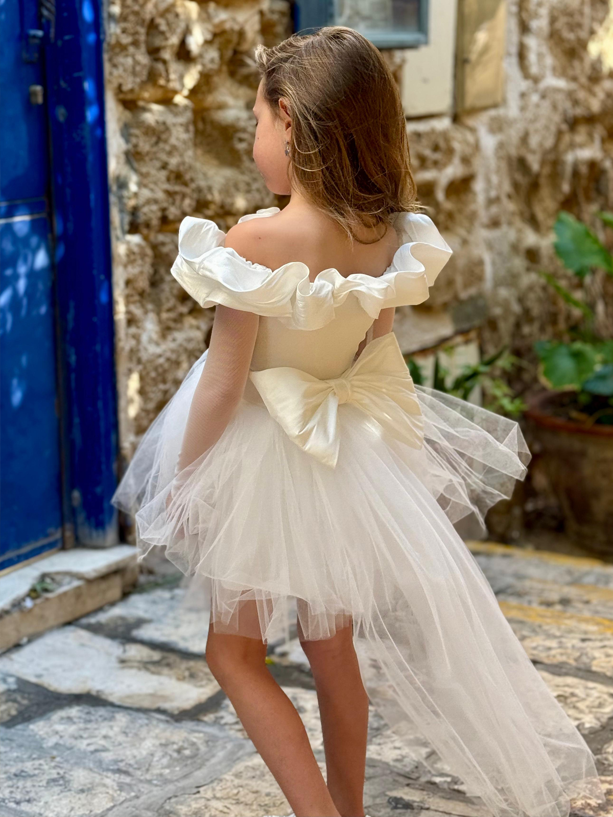 שמלת שושבינה טוטו חובקת כתפיים בשילוב בד טפט ושרוולי שיפון לייקרה דקיקים ועדינים עם פפיון גדול ומתוק עם שובל שניתן לחבר ולהסיר בעזרת סיכה