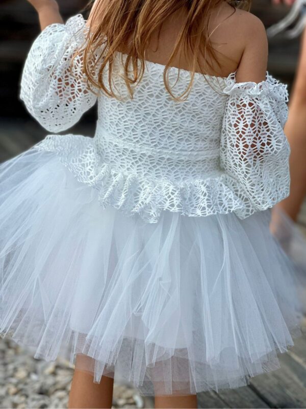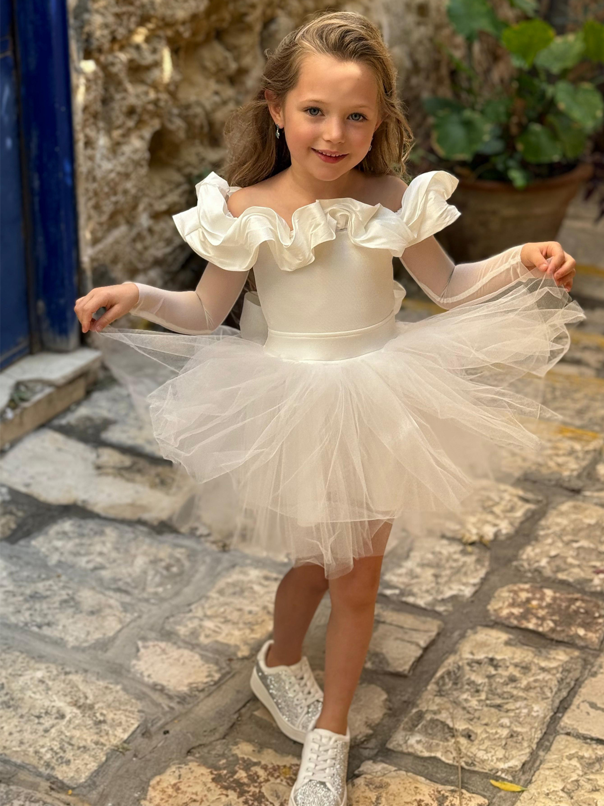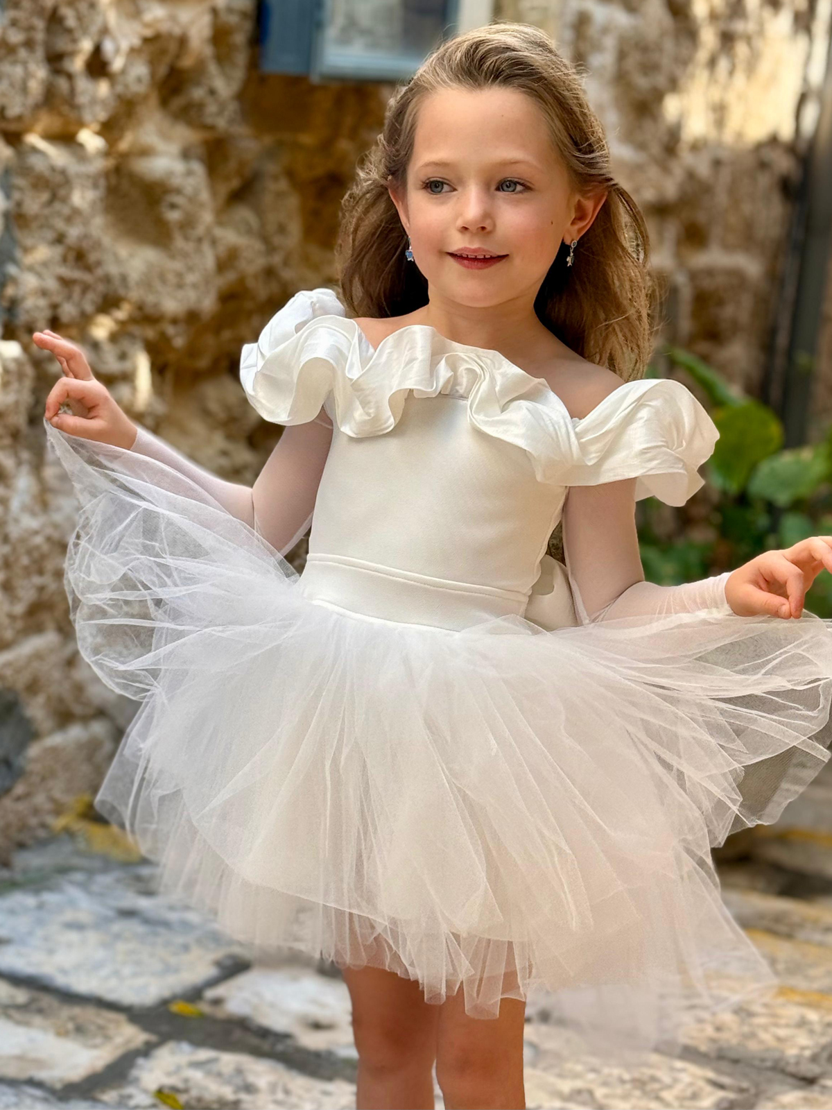 שמלת שושבינה טוטו חובקת כתפיים בשילוב בד טפט ושרוולי שיפון לייקרה דקיקים ועדינים עם פפיון גדול ומתוק עם שובל שניתן לחבר ולהסיר בעזרת סיכה