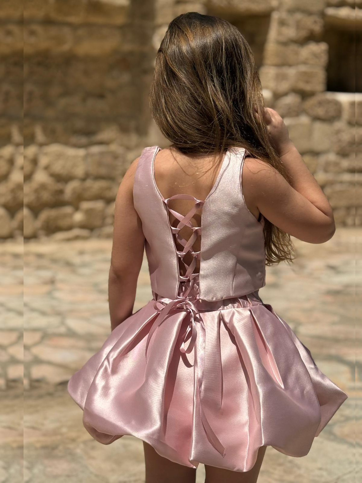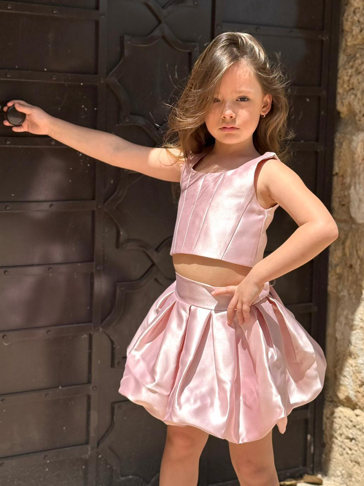 סט חצאית בלון ומחוך מתופר עם קשירות בגב מבד מיקדו הבוהק והיוקרתי. סט מתוק וחגיגי שגונב את ההצגה