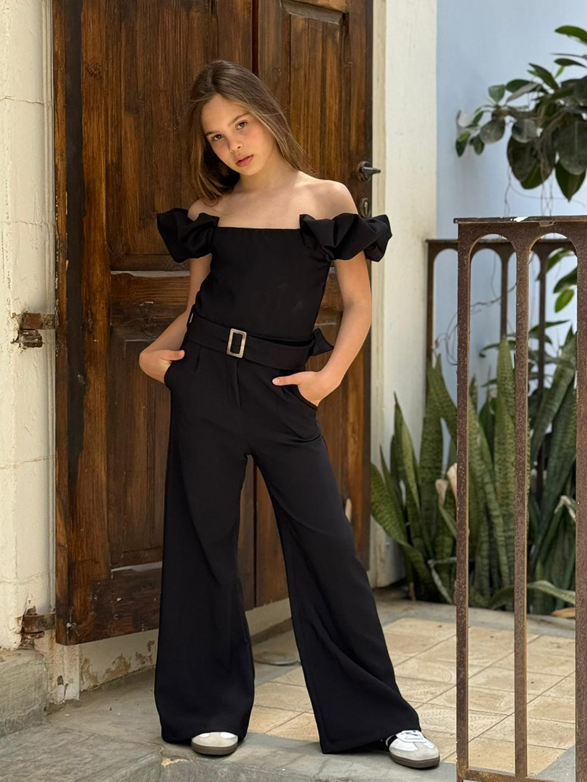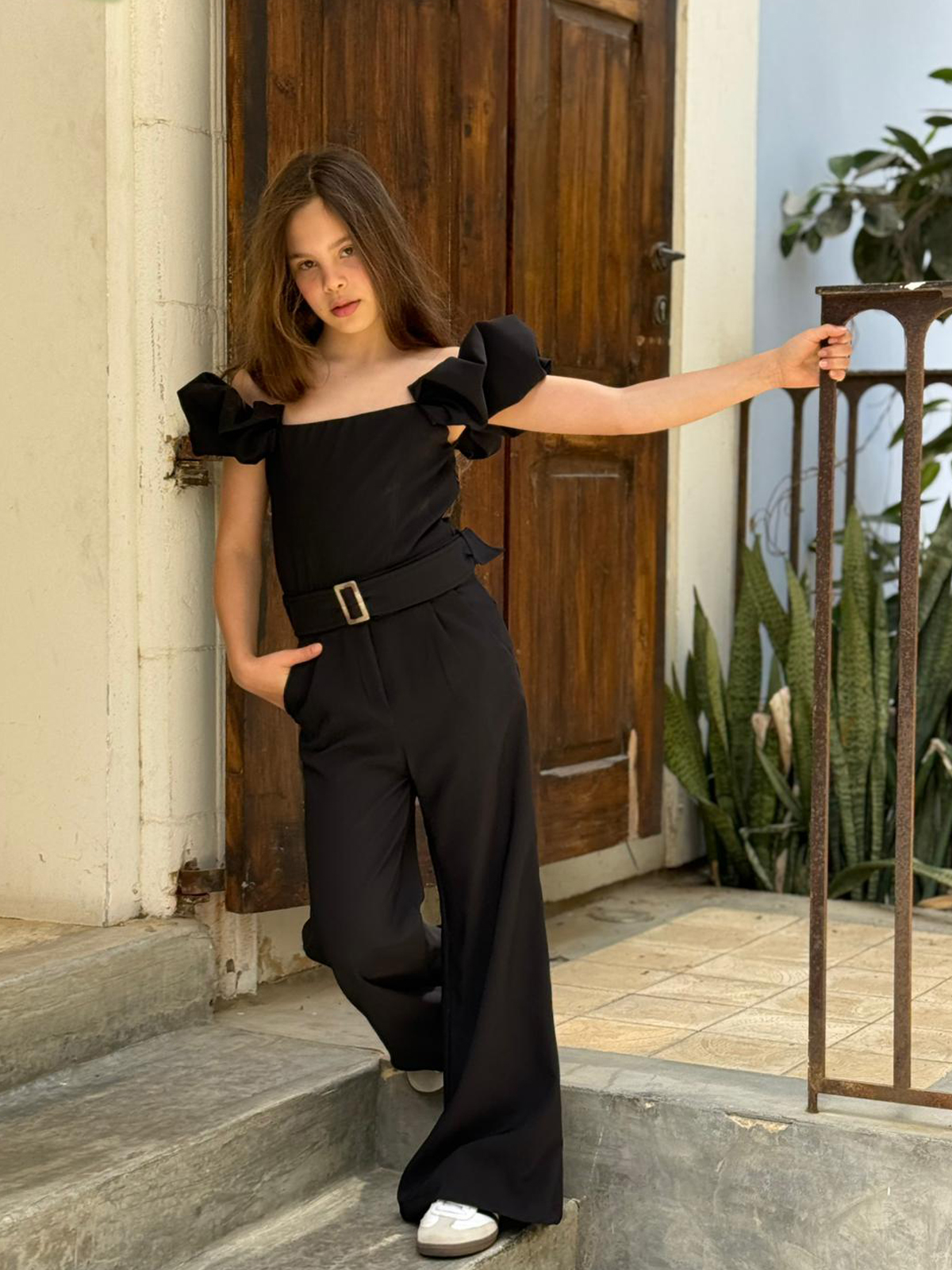 אוברול מחויט בגזרה מתרחבת עם חזית מתופרת וחגורת אבזם, כתפיות ריג’ חובקות ואלגנטיות