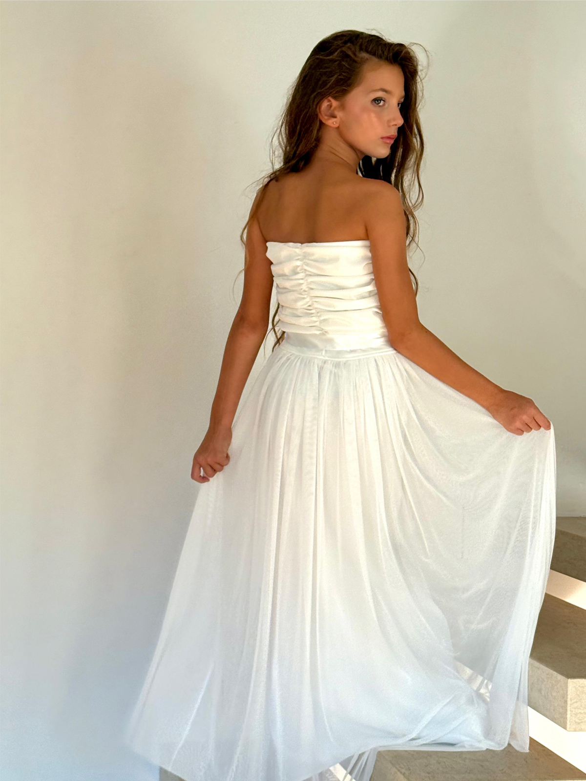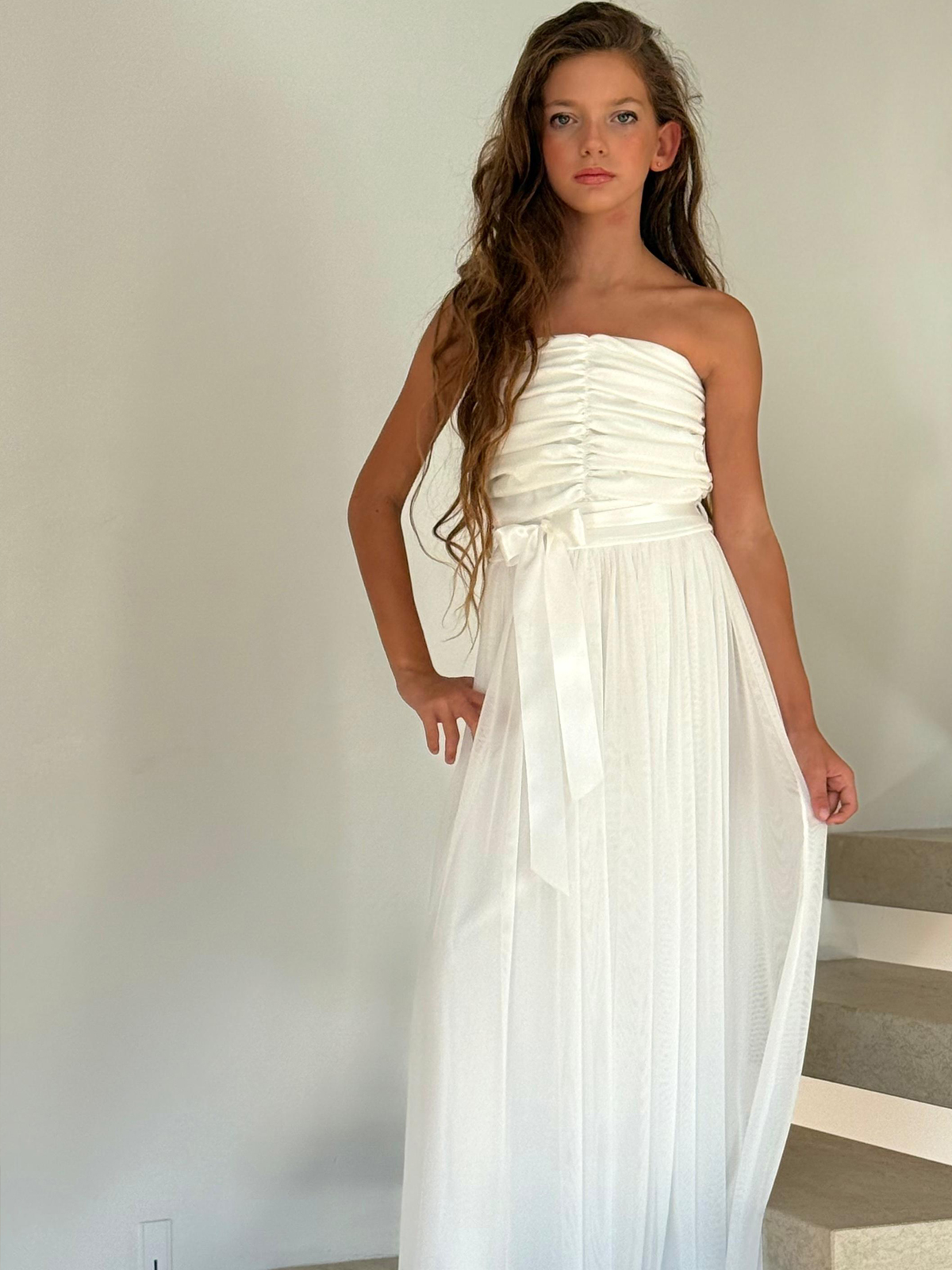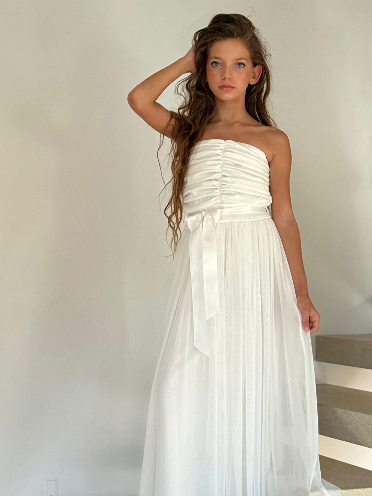 שמלת מקסי מטול שיפון נשפך, בחלק העליון כיווצים מבד לייקרה מנצנץ עם קשירת במותן. שמלה חלומית לכל ילדת בת מצווה.