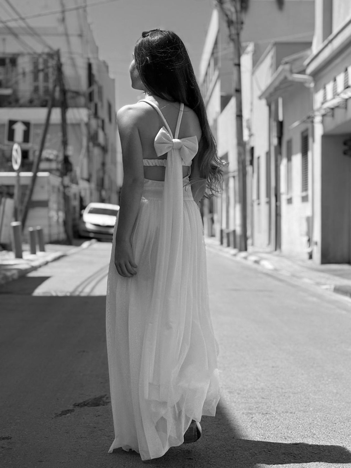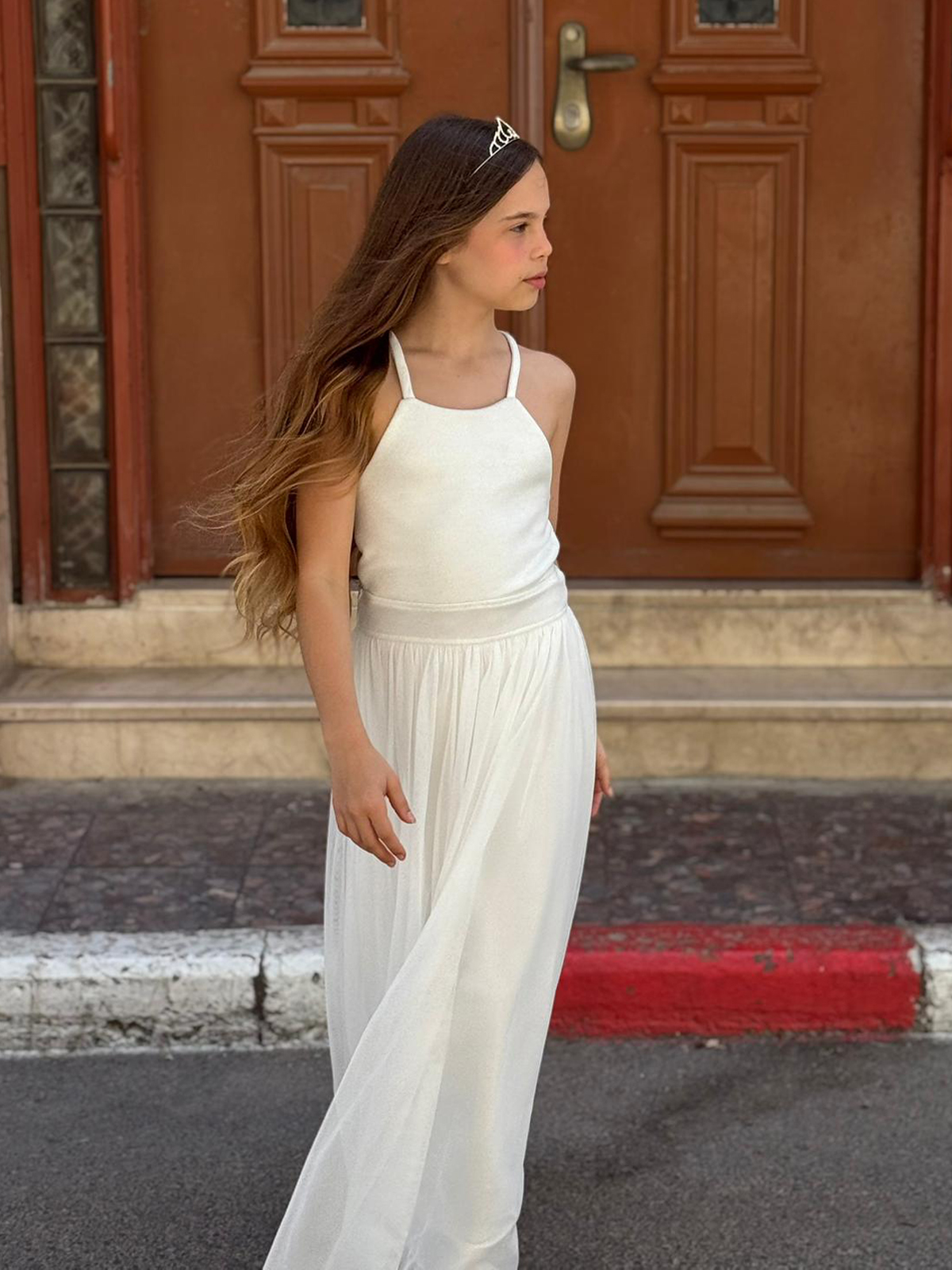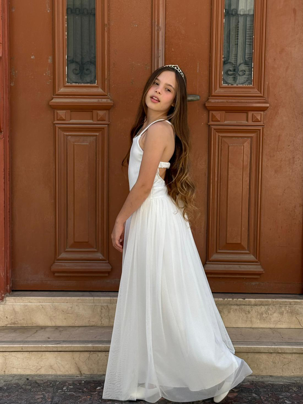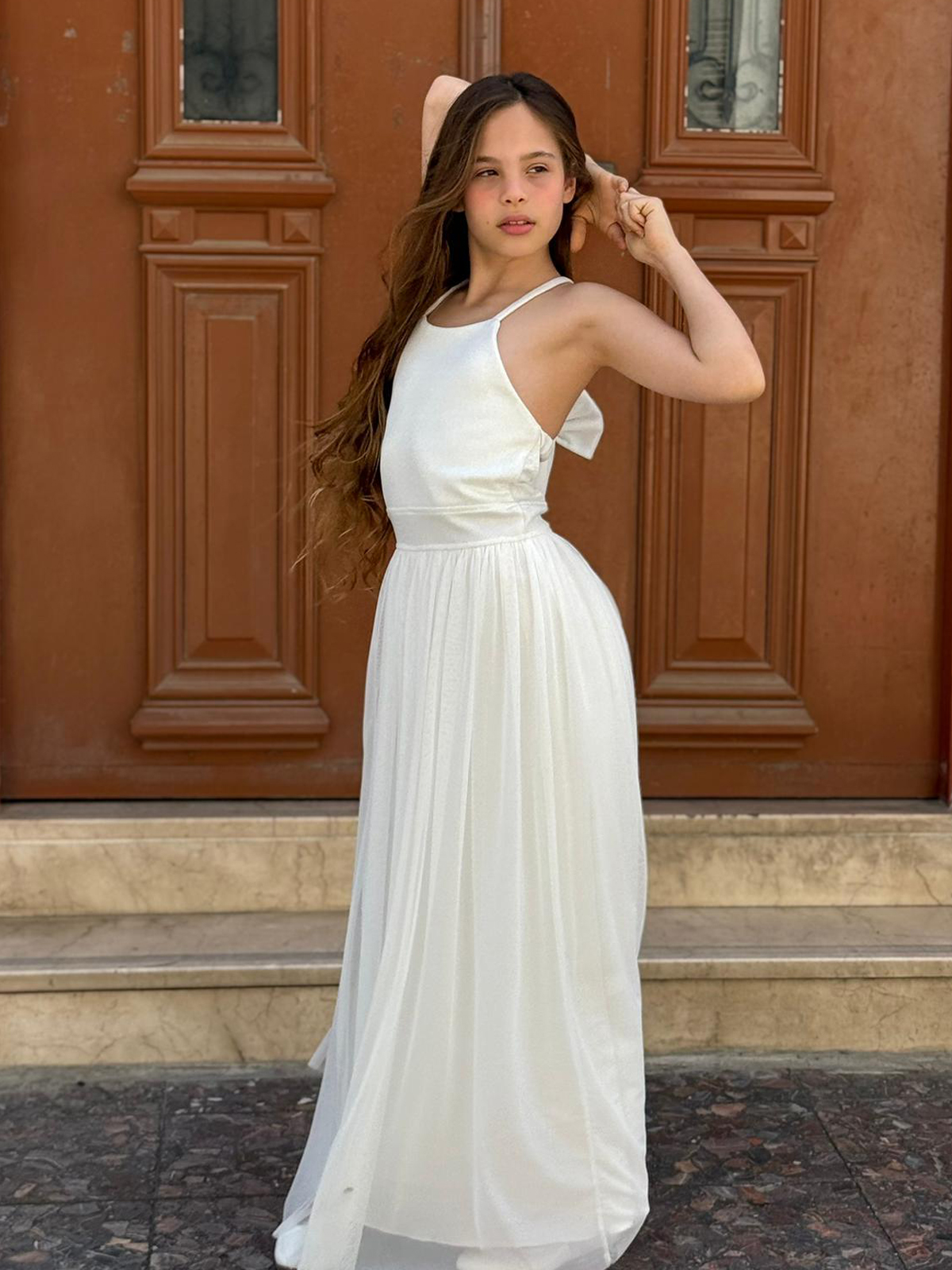 שמלת מקסי מטול שיפון נשפך בגזרת קולר ופפיון גב עם שובל. שמלה חלומית לכל ילדת בת מצווה.