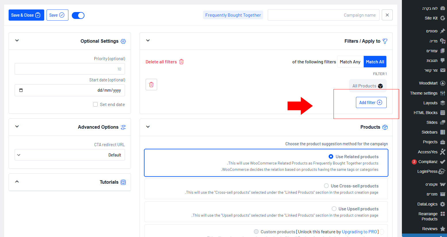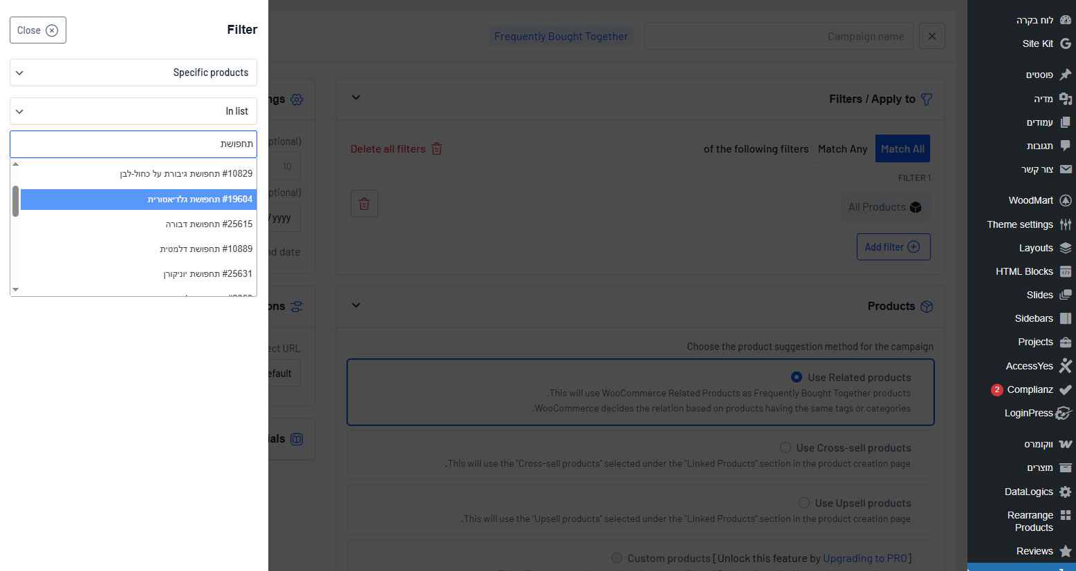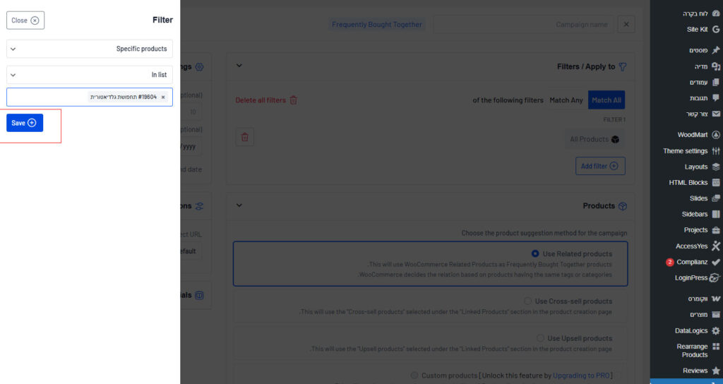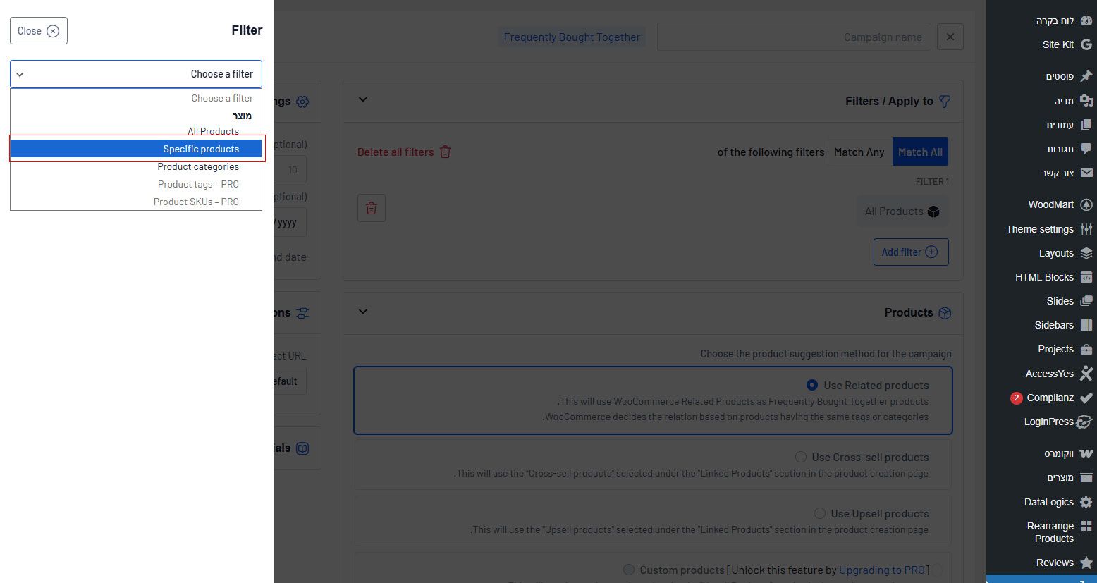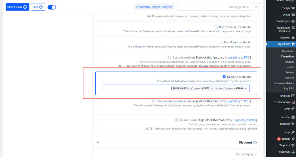8. לגלול למטה ולבחור Specific products ולהוסיף את המוצר שהוספנו בפילטר + המוצר של ה Upsell