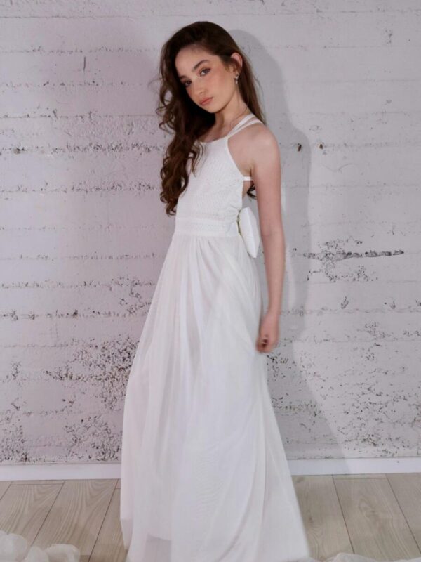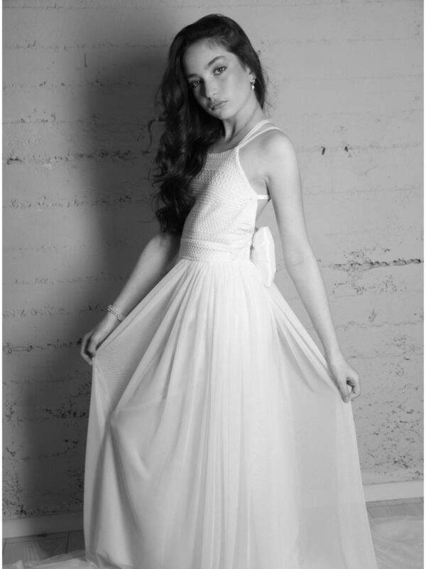 שמלת שושבינה מקסי טול, מסתובבת ונסיכותית, בגזרת גופייה עם פפיונים מושלמים בגב מבד פודנש, בד בוהק ויוקרתי