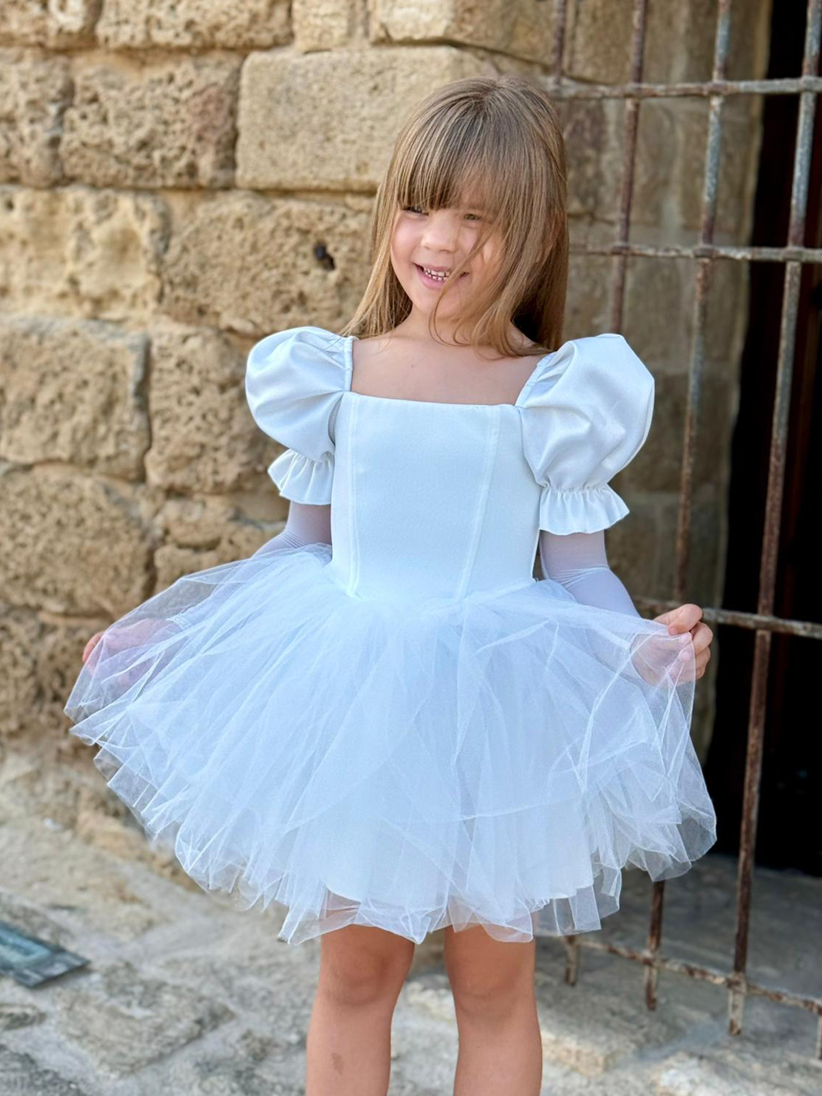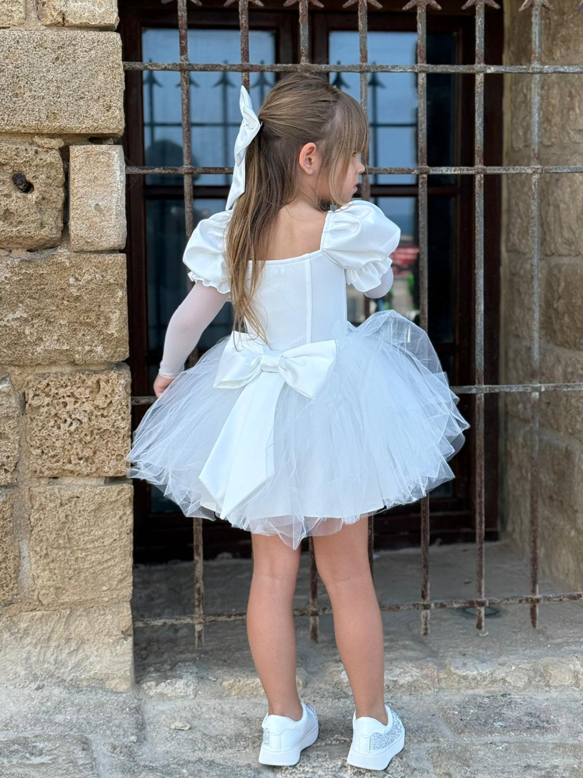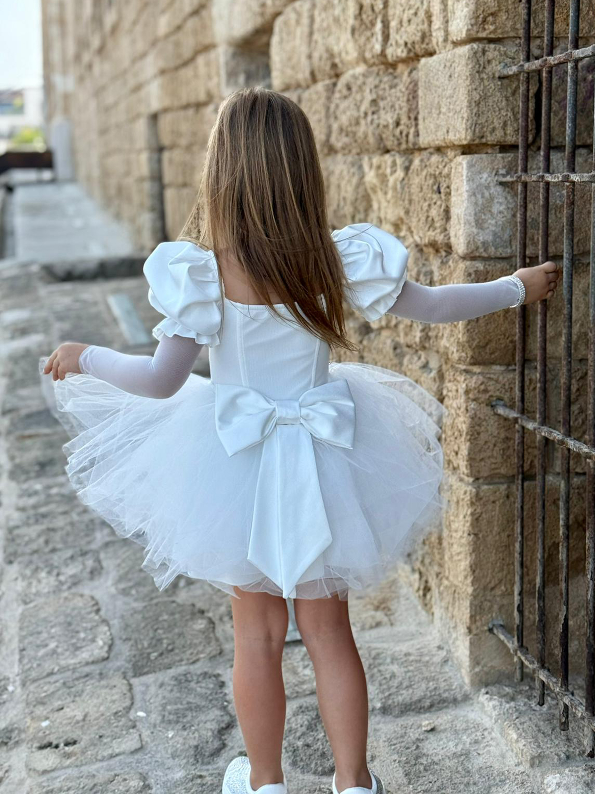 שמלת טוטו מתופרת משלובת בד פודנש, בד סטן בוהק ויוקרתי, שרוולים תפוחים, ופפיון גדול בגב.
