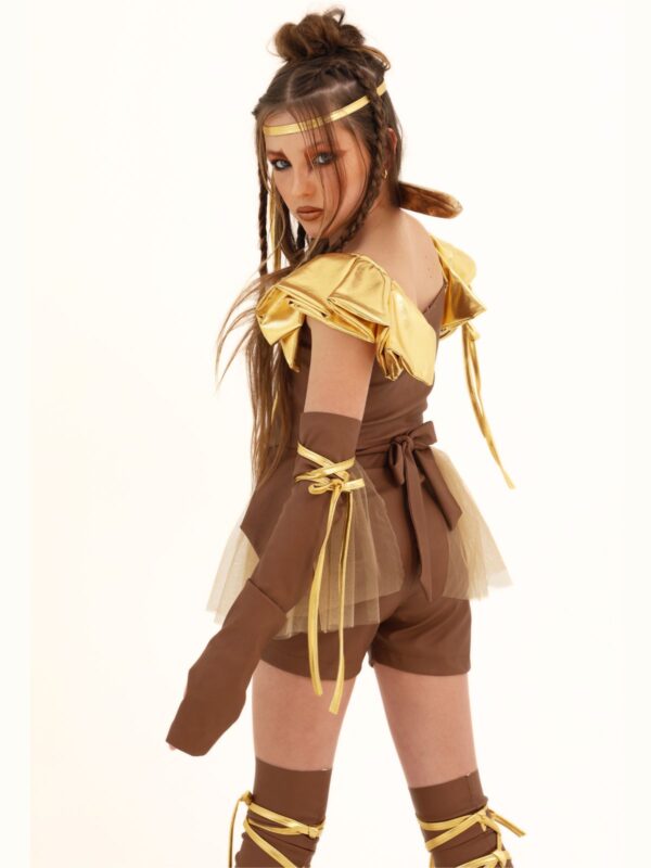 תחפושת נערת חלל לילדות, תחפושת מקורית שיורדת לפרטים הקטנים וכוללת את כל האביזרים: אוברול טוטו מנצנץ עם שובל טול, חותלות ריג’, כפפות וקשת.